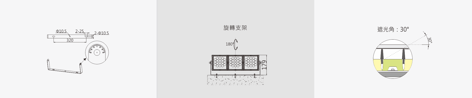 蜂巢式防眩光設計。防眩光角度達到30°,多種發光角度可選擇。