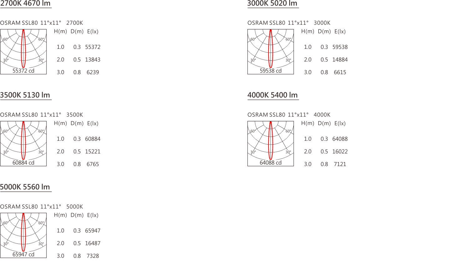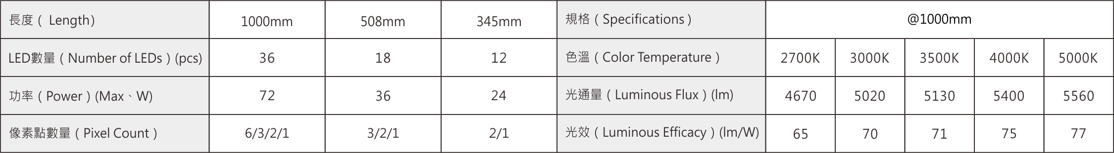 色溫(Color Temperature):2700K、3000K、3500K、4000K、5000K