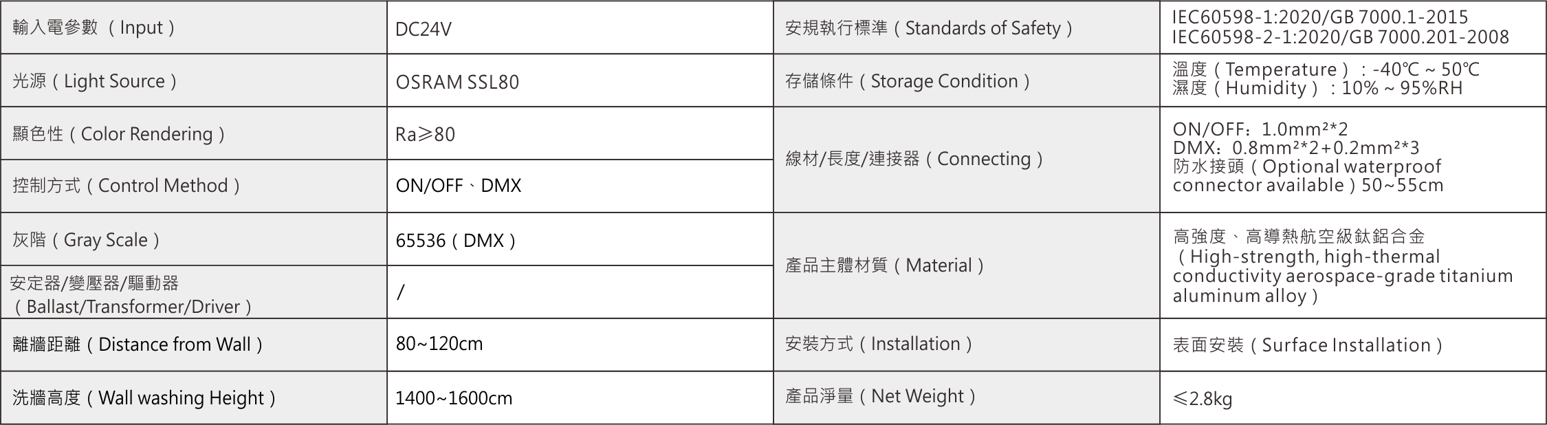 功率: 72W 電壓: DC24V 光束角:11°*11° 洗牆高度: 14~16米