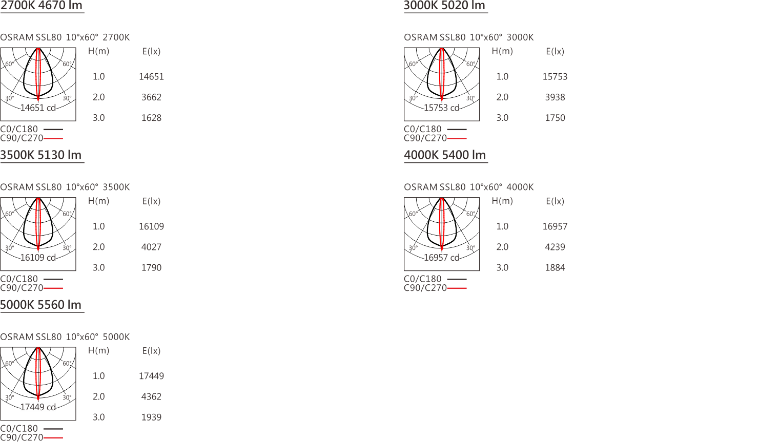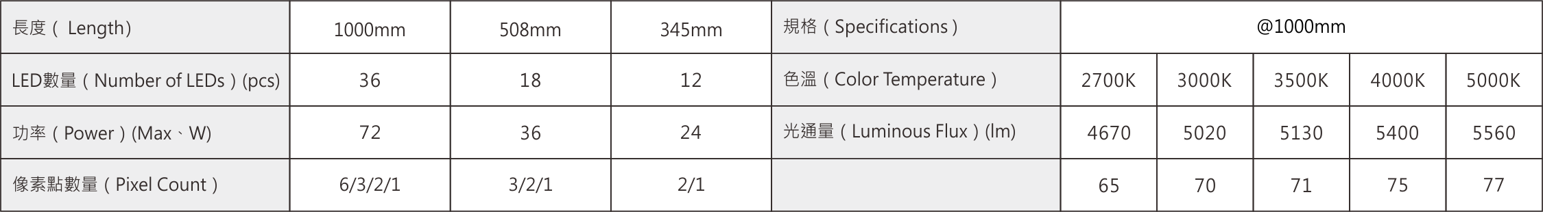 色溫(Color Temperature):2700K、3000K、3500K、4000K、5000K