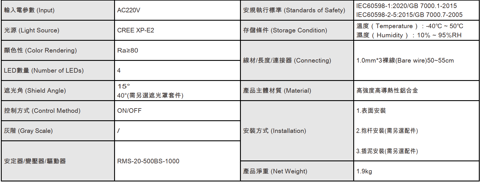功率: 15W 電壓: AC220V 控制方式:ON/OFF 光色:W 燈數:4 光束角: 7°、10°
