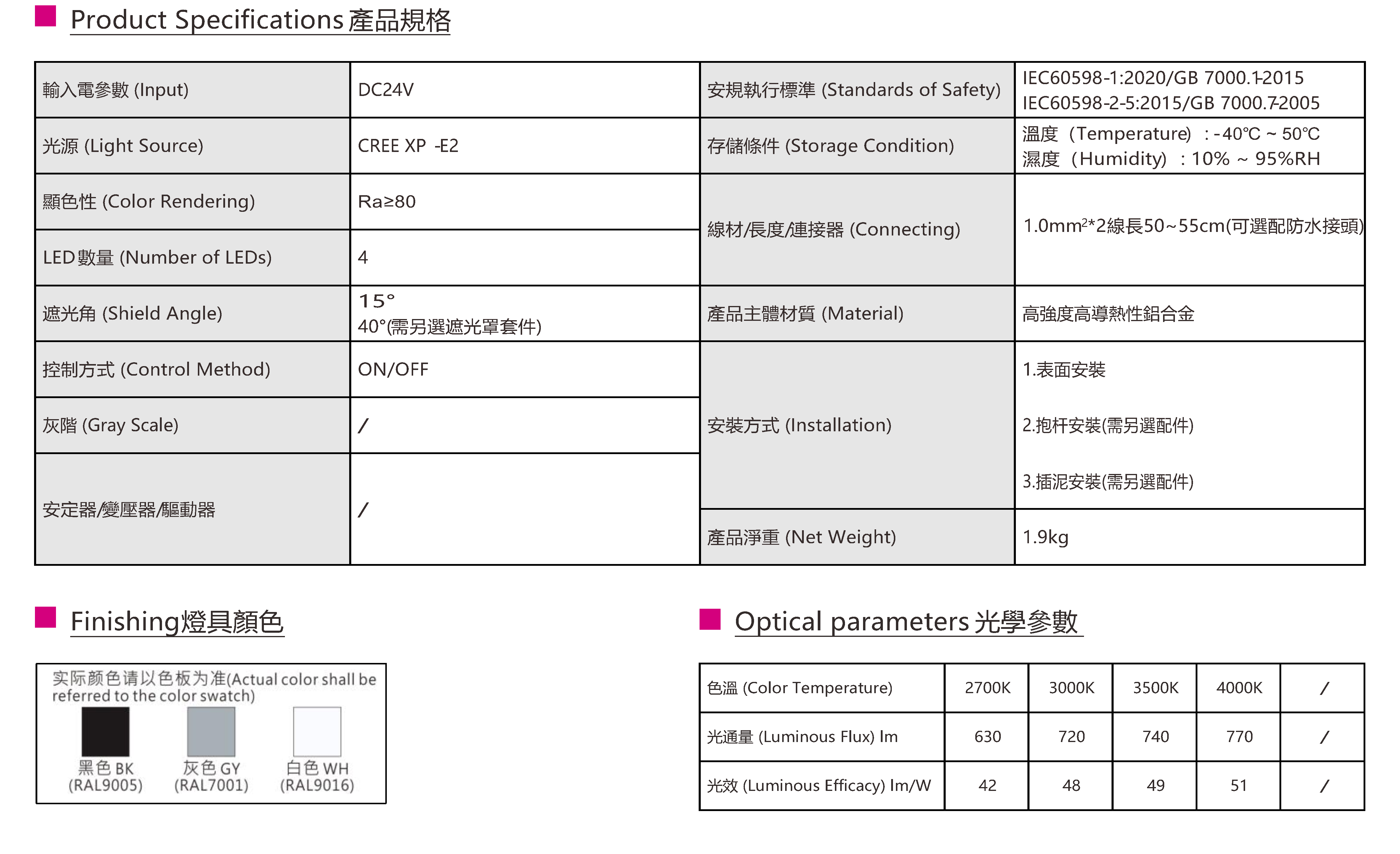 色溫(Color Temperature):2700K、3000K、3500K、4000K