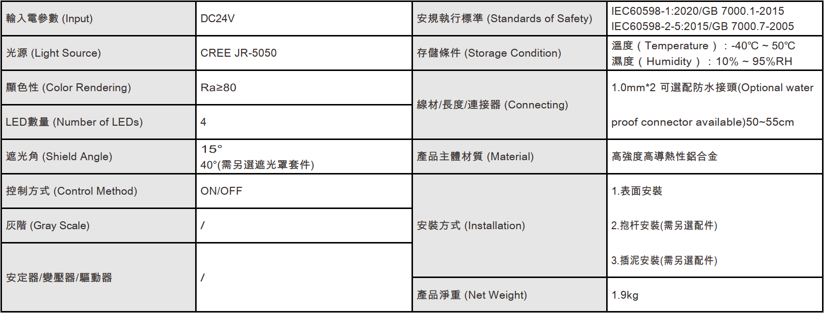 功率: 15W 電壓: DC24V 控制方式:ON/OFF 光色:W 燈數:4 光束角: 20°、30°、40°、55°