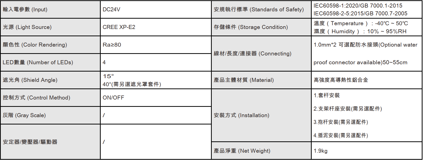 功率: 15W 電壓: DC24V 控制方式:ON/OFF 光色:W 燈數:4 光束角: 7°、10°
