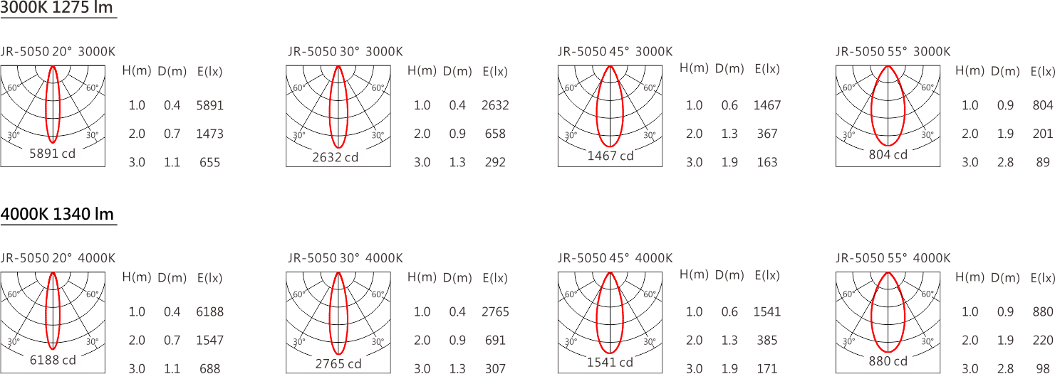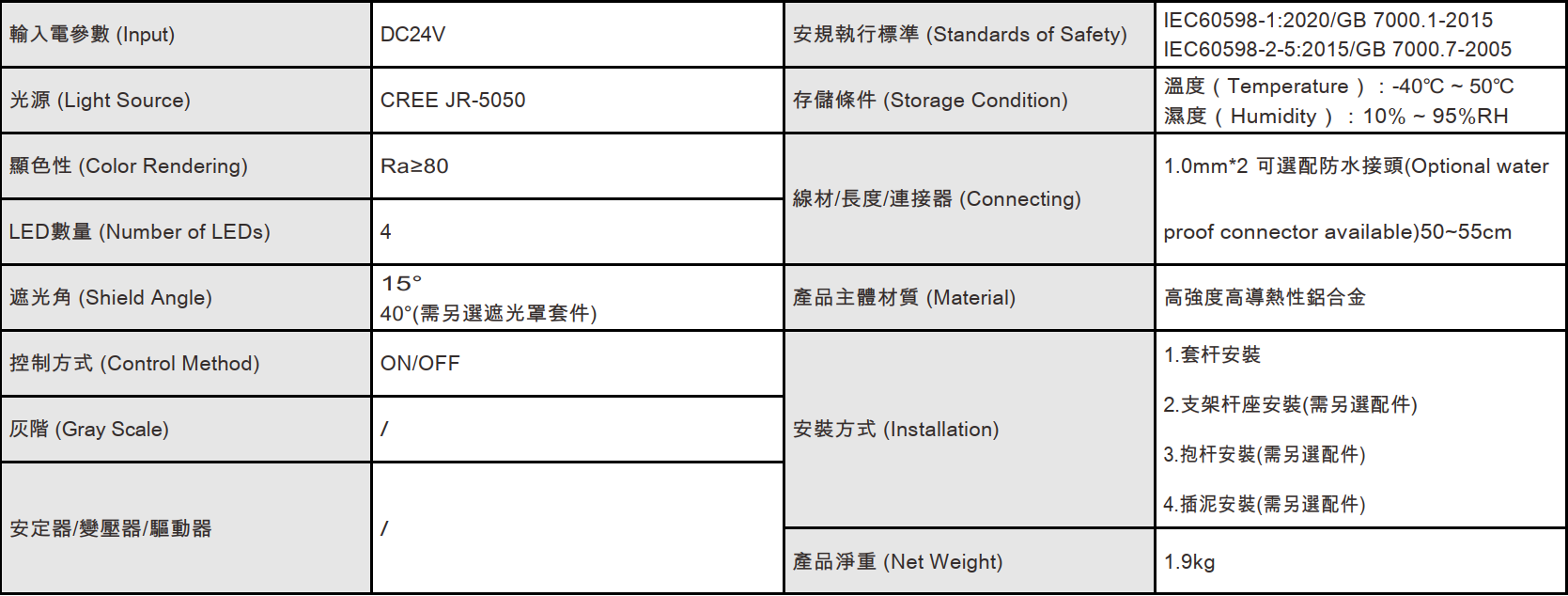 功率: 15W 電壓: DC24V 控制方式:ON/OFF 光色:W 燈數:4 光束角: 20°、30°、40°、55°
