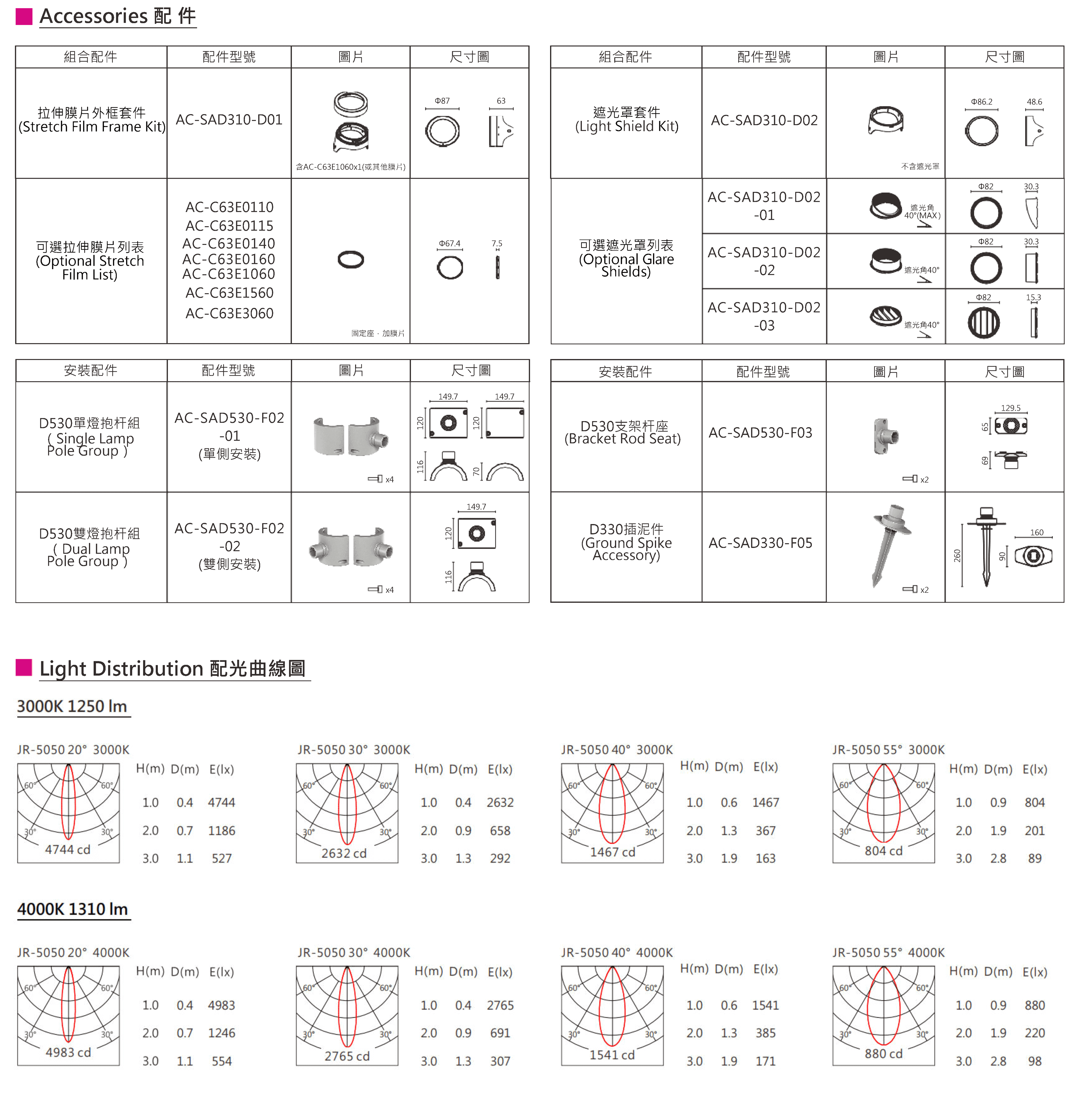 光束角(Beam Angle):20°、30°、40°、55°