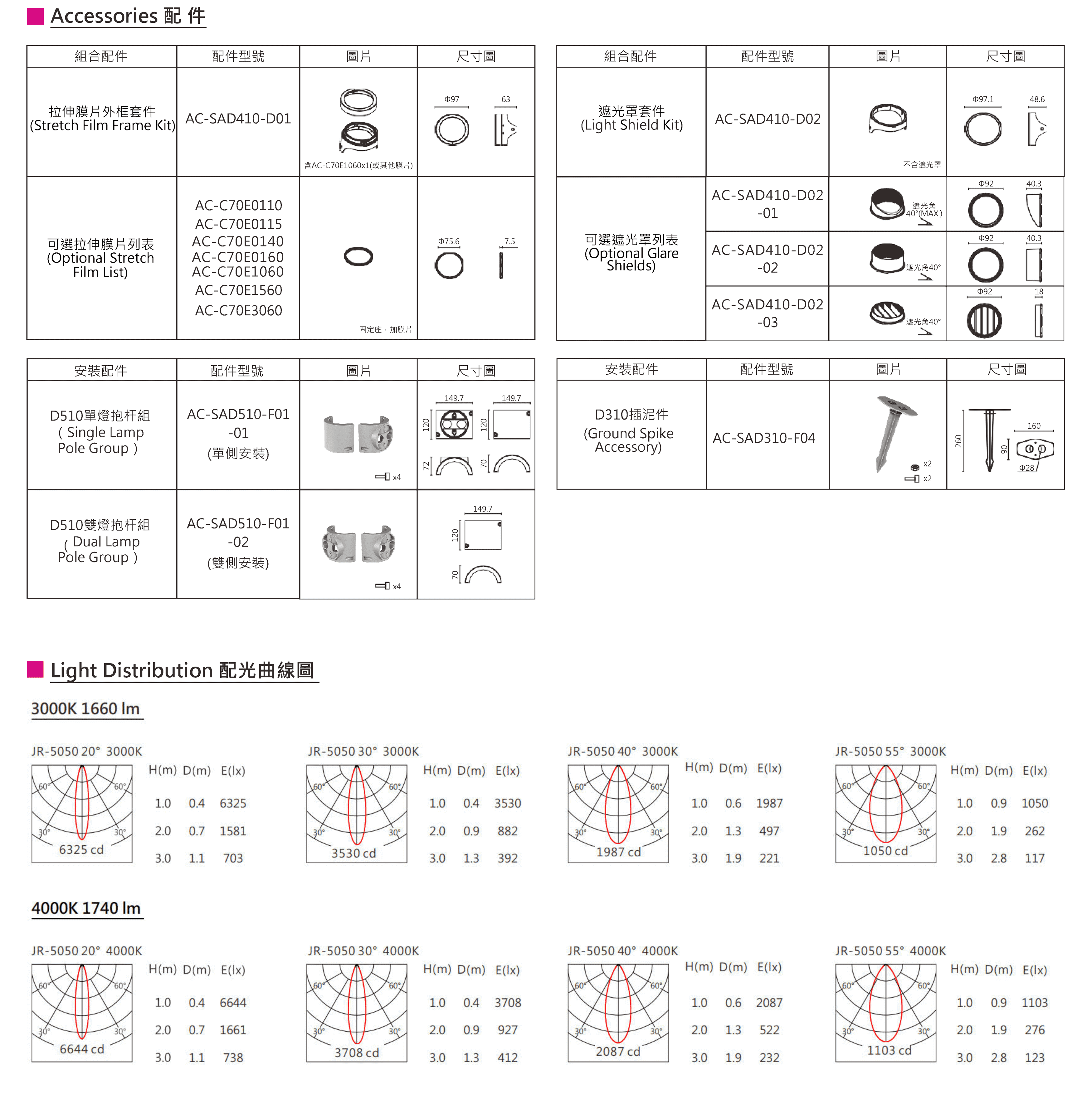 光束角(Beam Angle):20°、30°、40°、55°