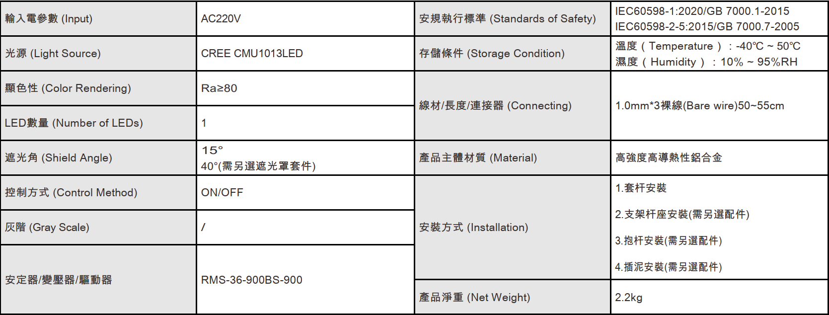 功率: 20W 電壓: AC220V 控制方式:ON/OFF 光色:W 燈數:1 光束角:15°、24°、36°、55°