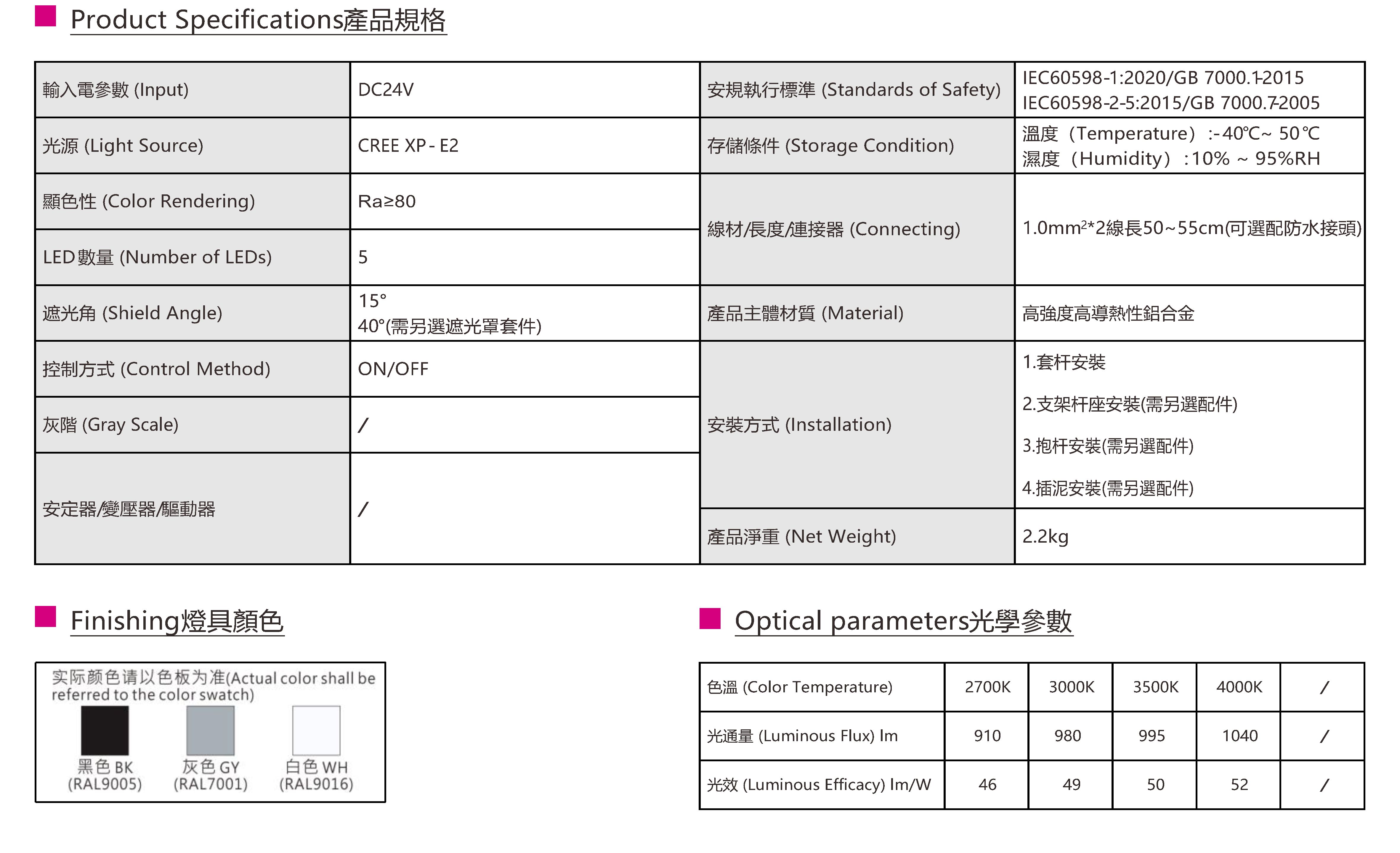 色溫(Color Temperature):2700K、3000K、3500K、4000K