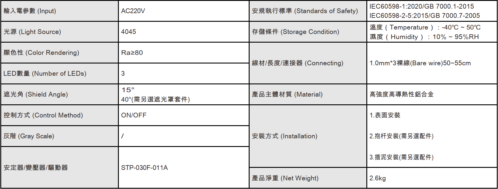 功率: 30W 電壓: AC220V 控制方式:ON/OFF 光色:W 燈數:3 光束角:3°