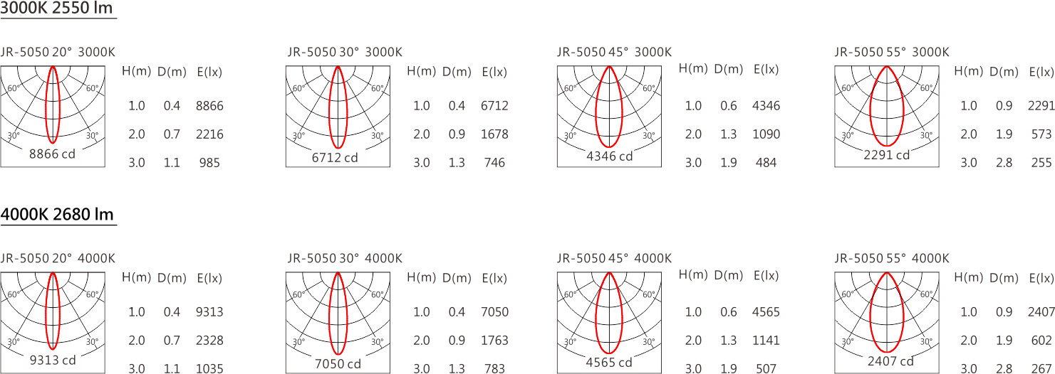 光束角(Beam Angle):20°、30°、40°、55°