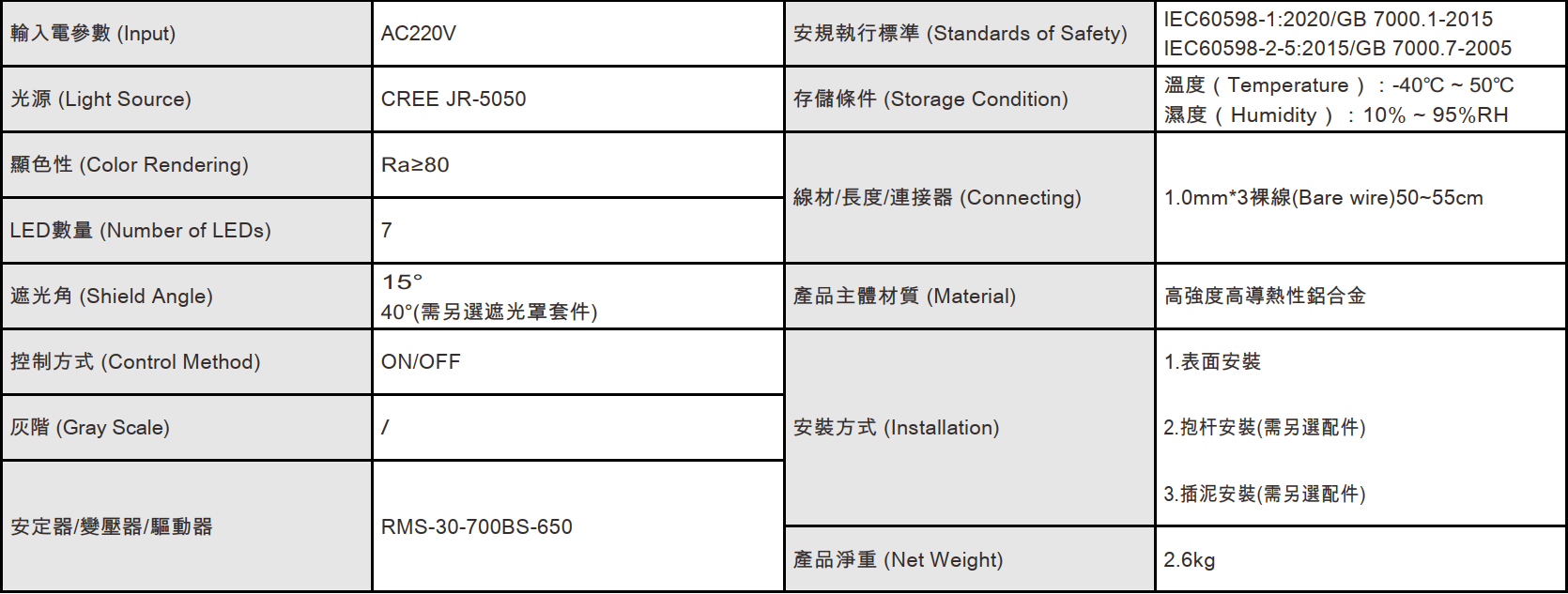 功率: 30W 電壓:AC220V 控制方式:ON/OFF 光色:W 燈數:7 光束角:20°、30°、40°、55°