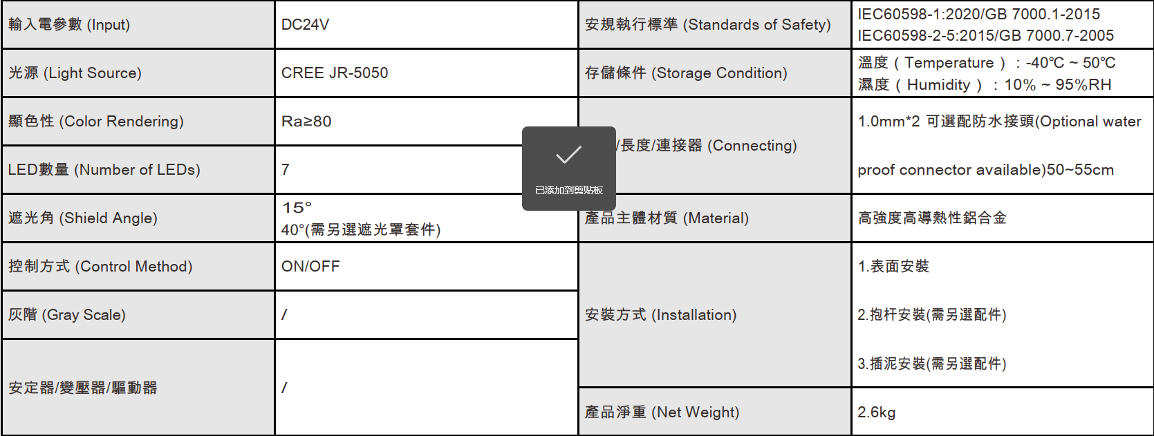 功率: 30W 電壓:DC24V 控制方式:ON/OFF 光色:W 燈數:7 光束角:20°、30°、40°、55°