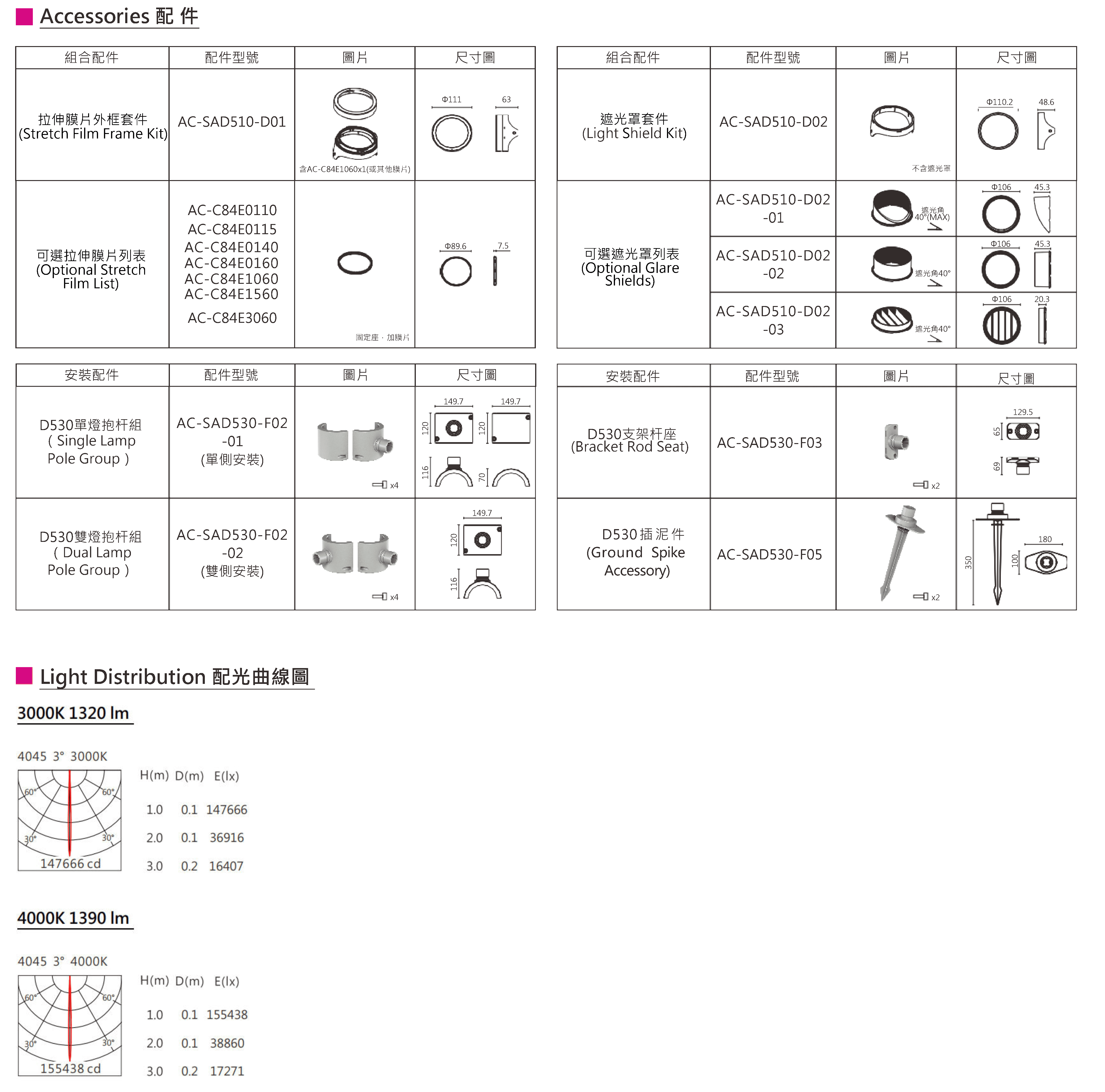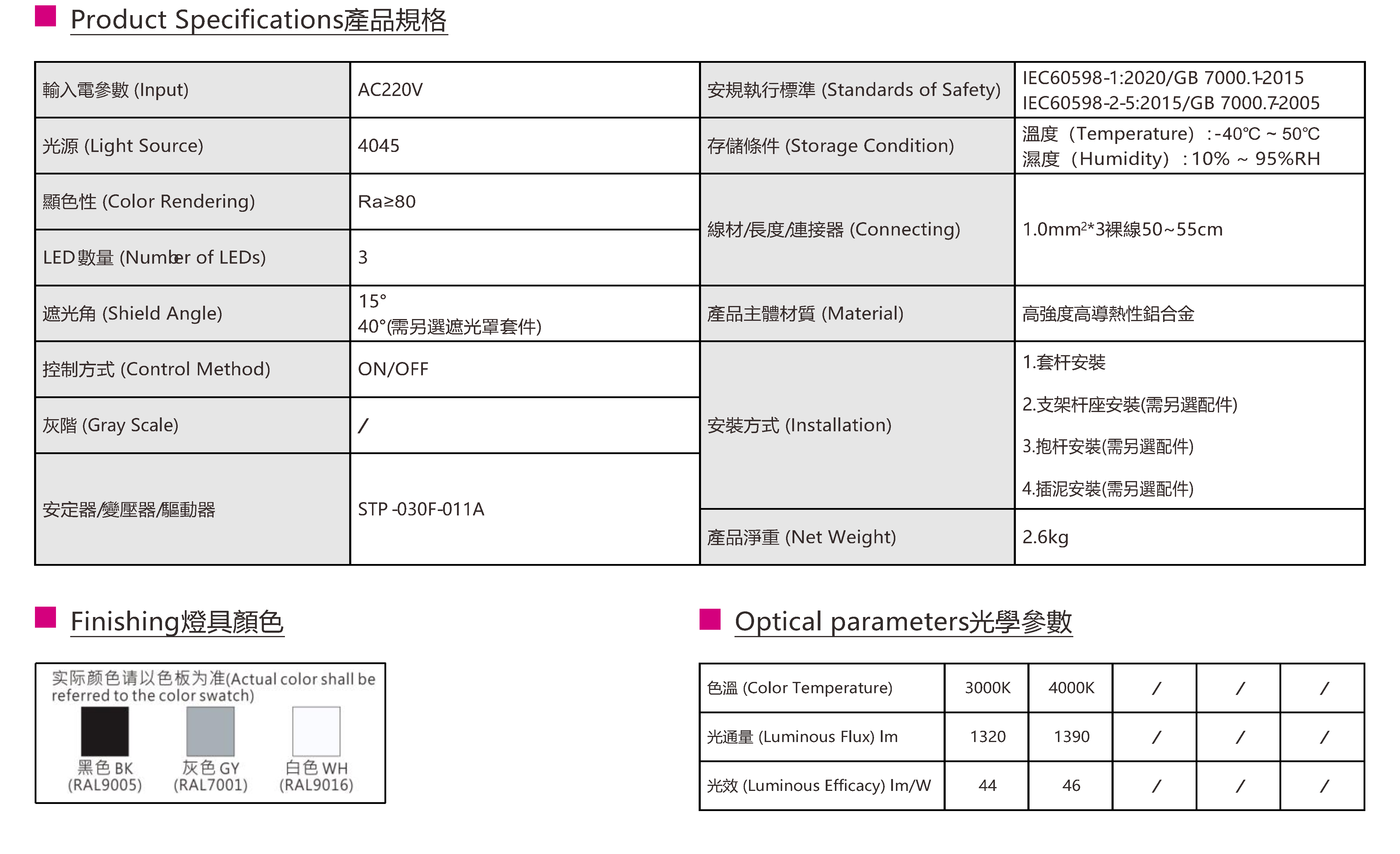 色溫(Color Temperature):3000K、4000K