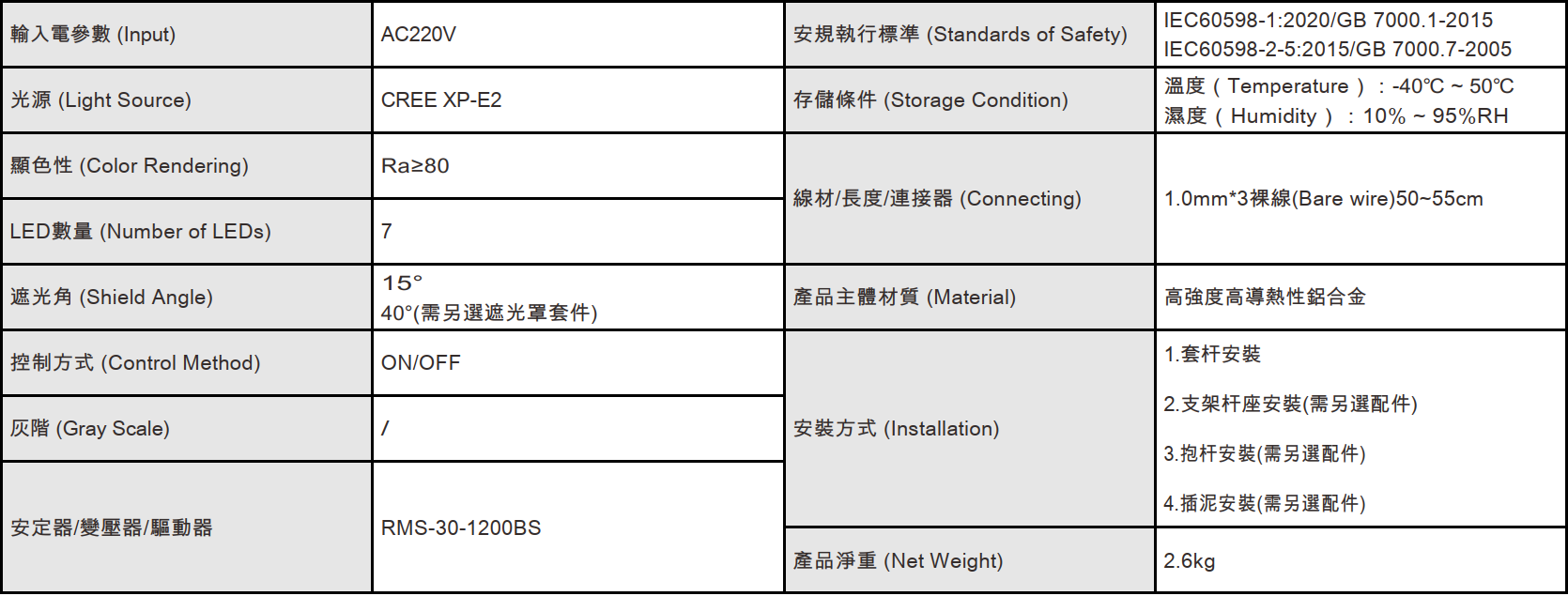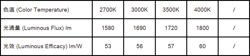 色溫(Color Temperature):2700K、3000K、3500K、4000K