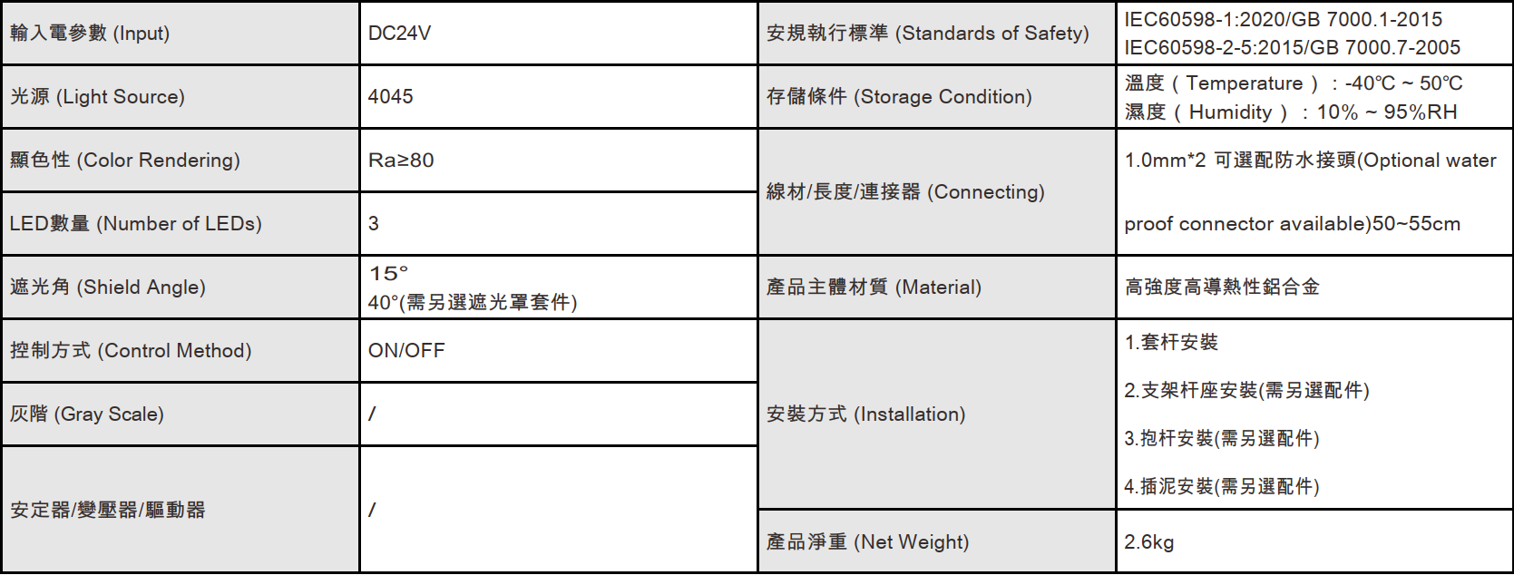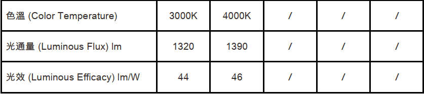 色溫(Color Temperature):3000K、4000K
