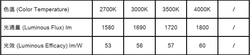 色溫(Color Temperature):2700K、3000K、3500K、4000K