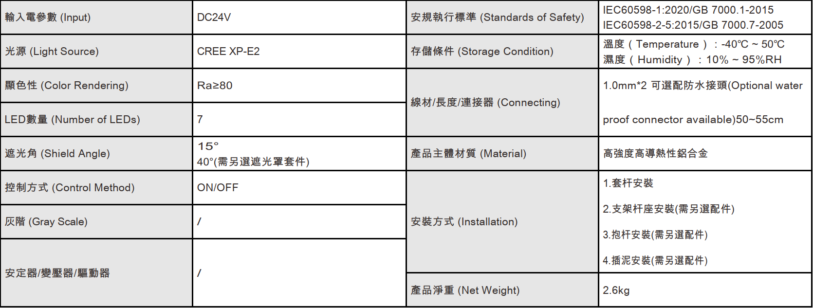 功率: 30W 電壓: DC24V 控制方式:ON/OFF 光色:W 燈數:7 光束角:7°、10°