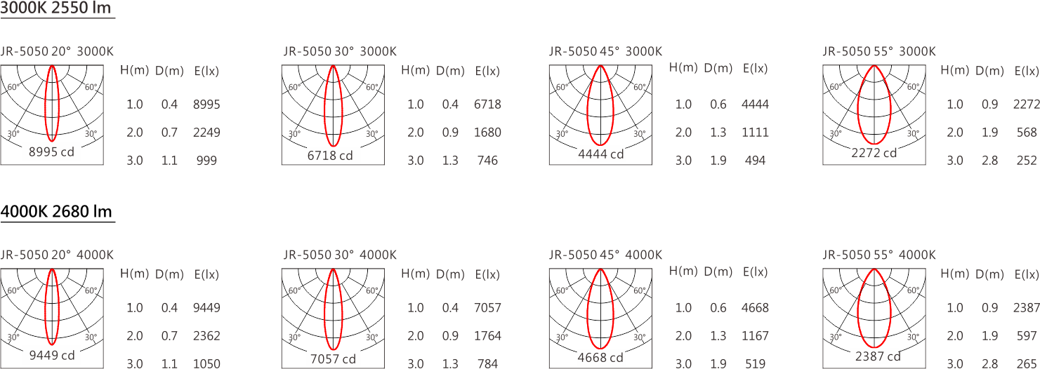 光束角(Beam Angle):20°、30°、40°、55°