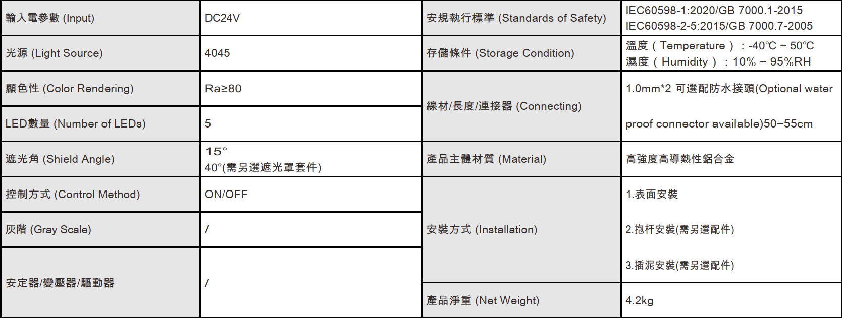 色溫(Color Temperature):3000K、4000K
