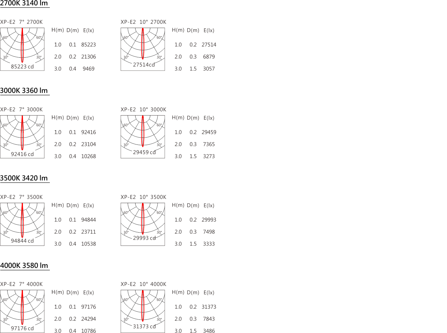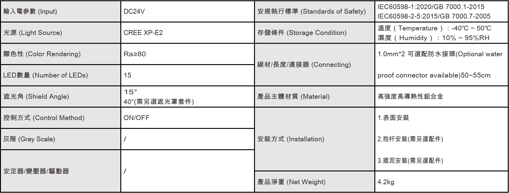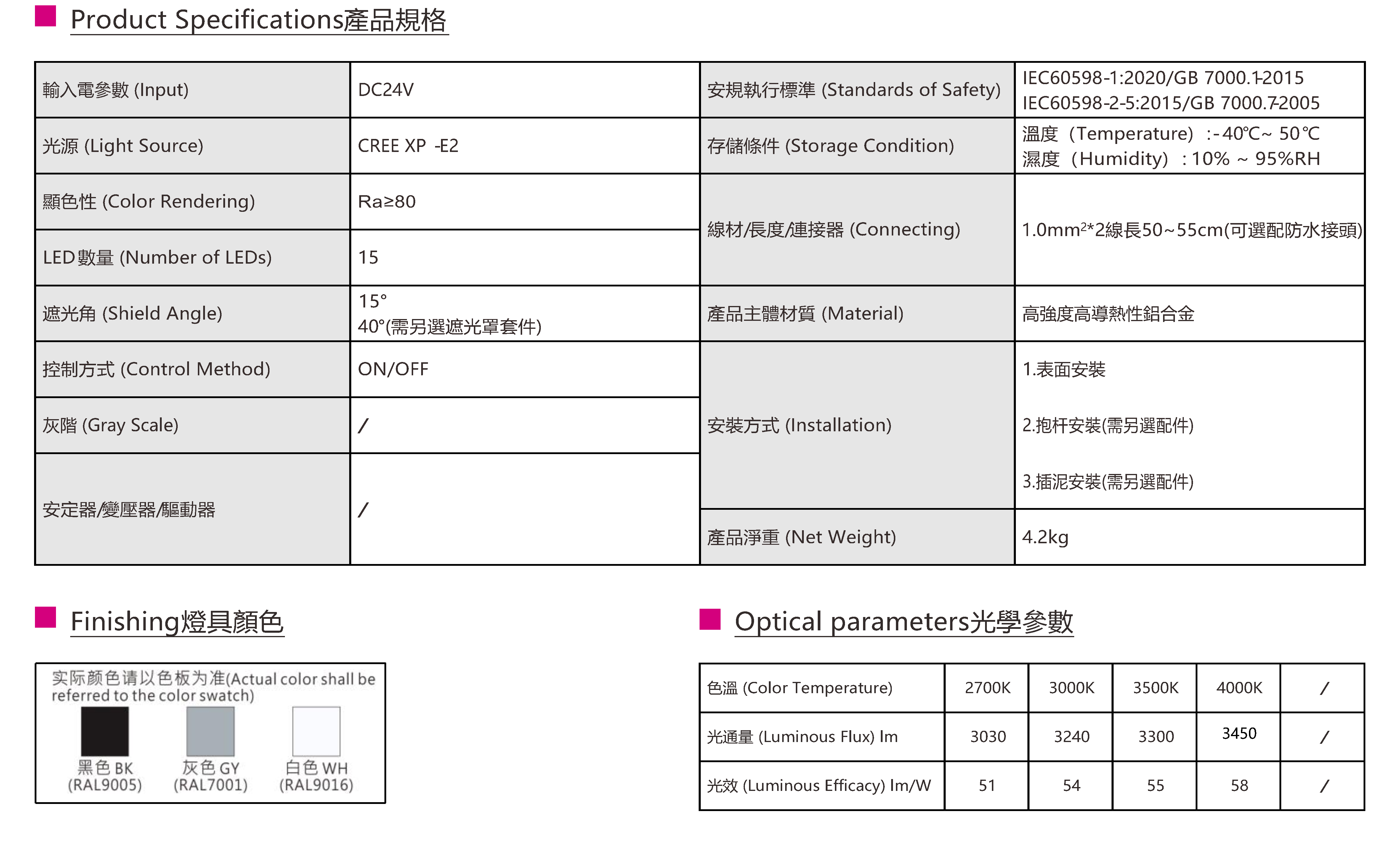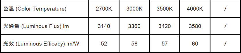 色溫(Color Temperature):2700K、3000K、3500K、4000K