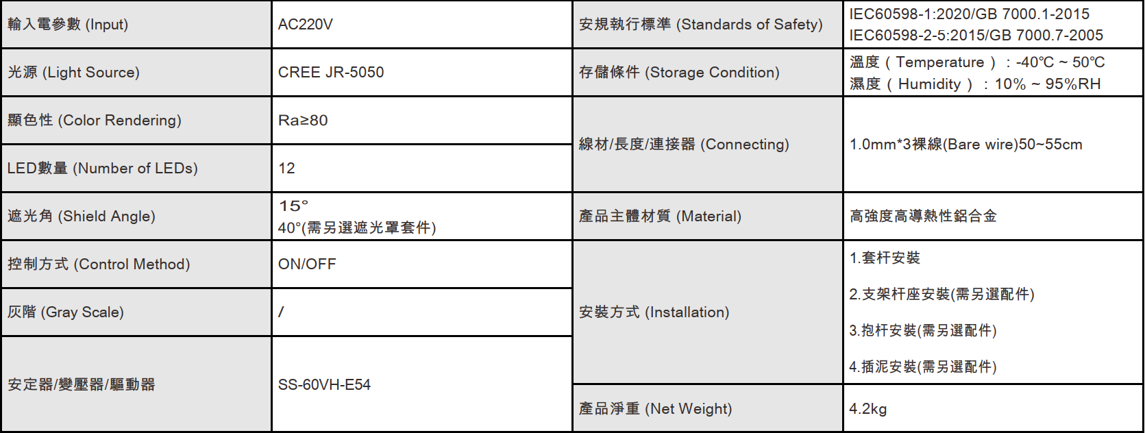 功率: 50W 電壓: AC220V 控制方式:ON/OFF 光色:W 燈數:12 光束角:20°、30°、40°、55°