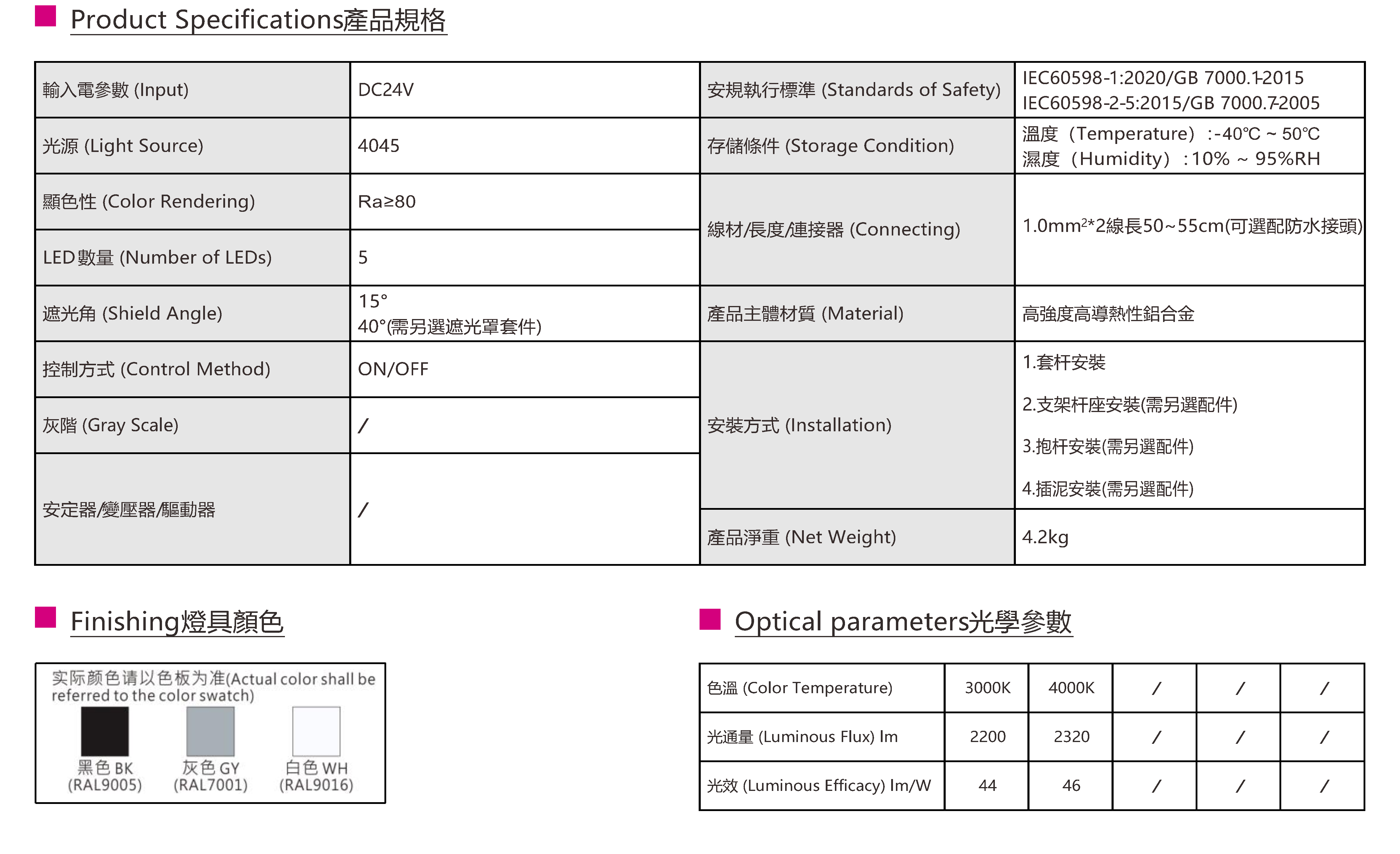 色溫(Color Temperature):3000K、4000K