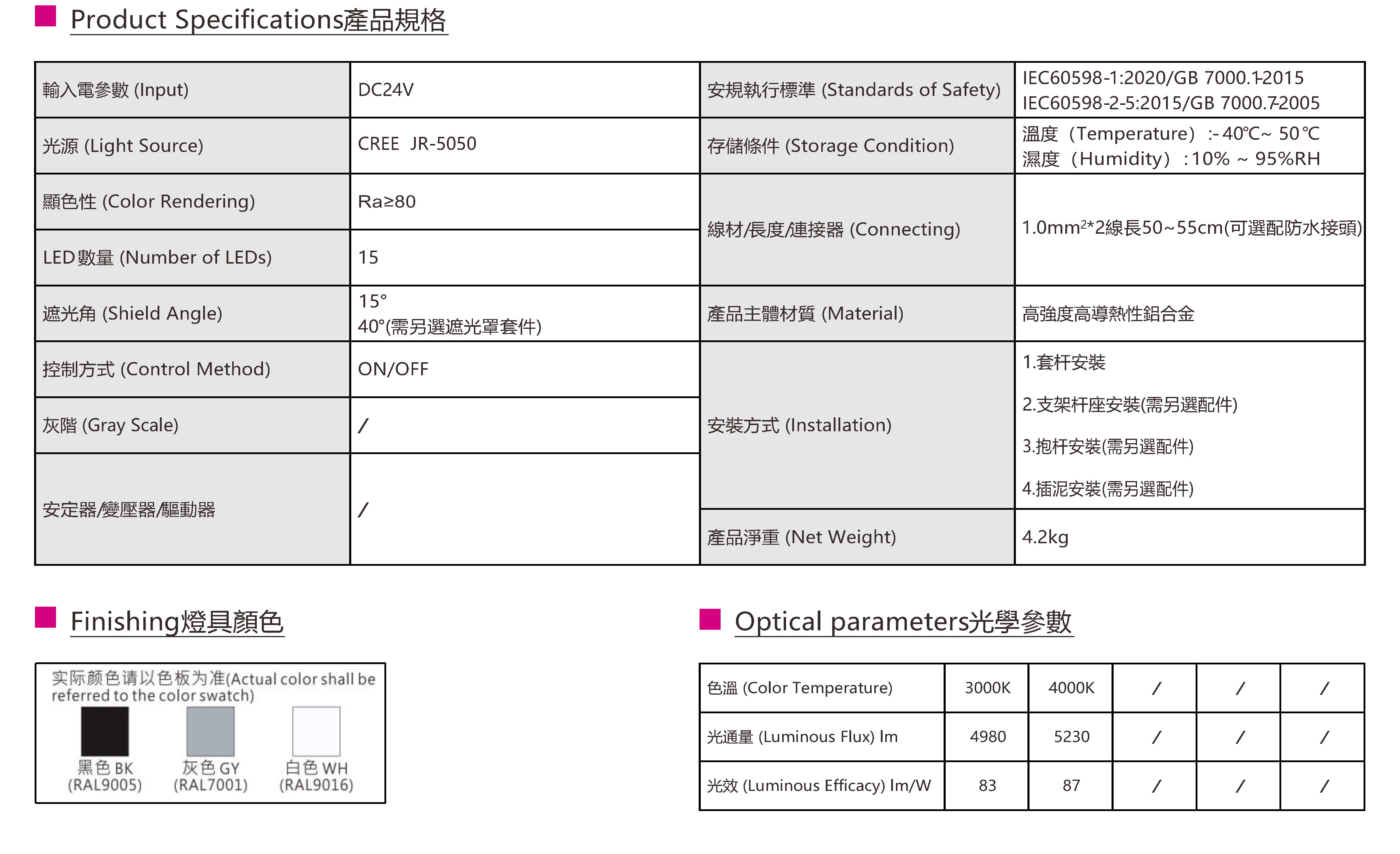 功率: 60W 電壓: DC24V 控制方式:ON/OFF 光色:W 燈數:15 光束角:20°、30°、40°、55°
