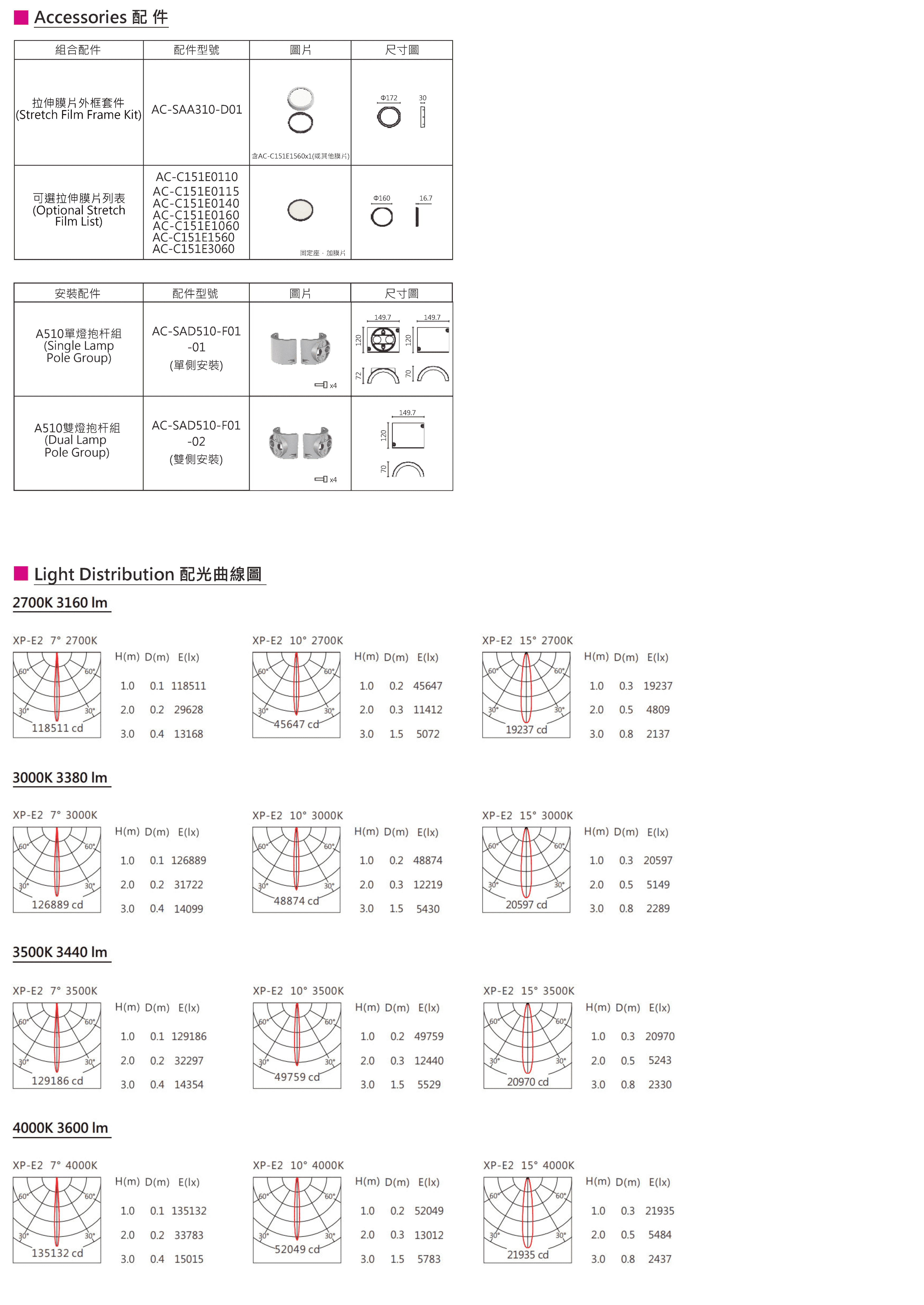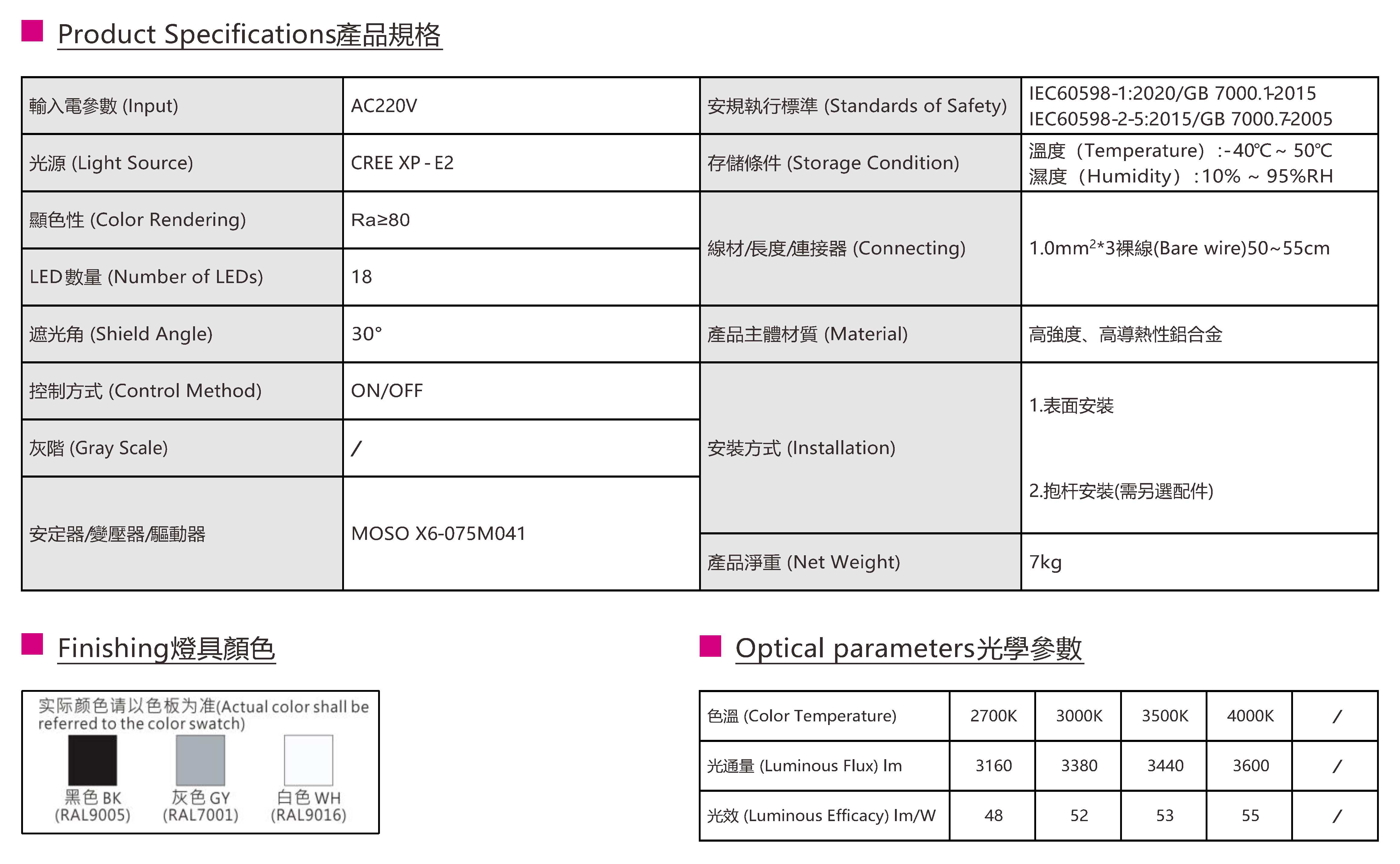色溫(Color Temperature):2700K、3000K、3500K、4000K