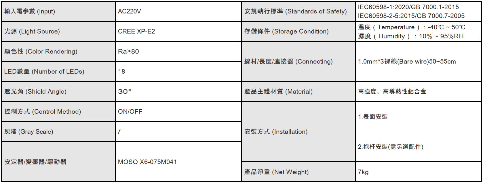 功率: 65W 電壓: AC220V 控制方式:ON/OFF 光色:W 燈數:18 光束角:7°、10°、15°