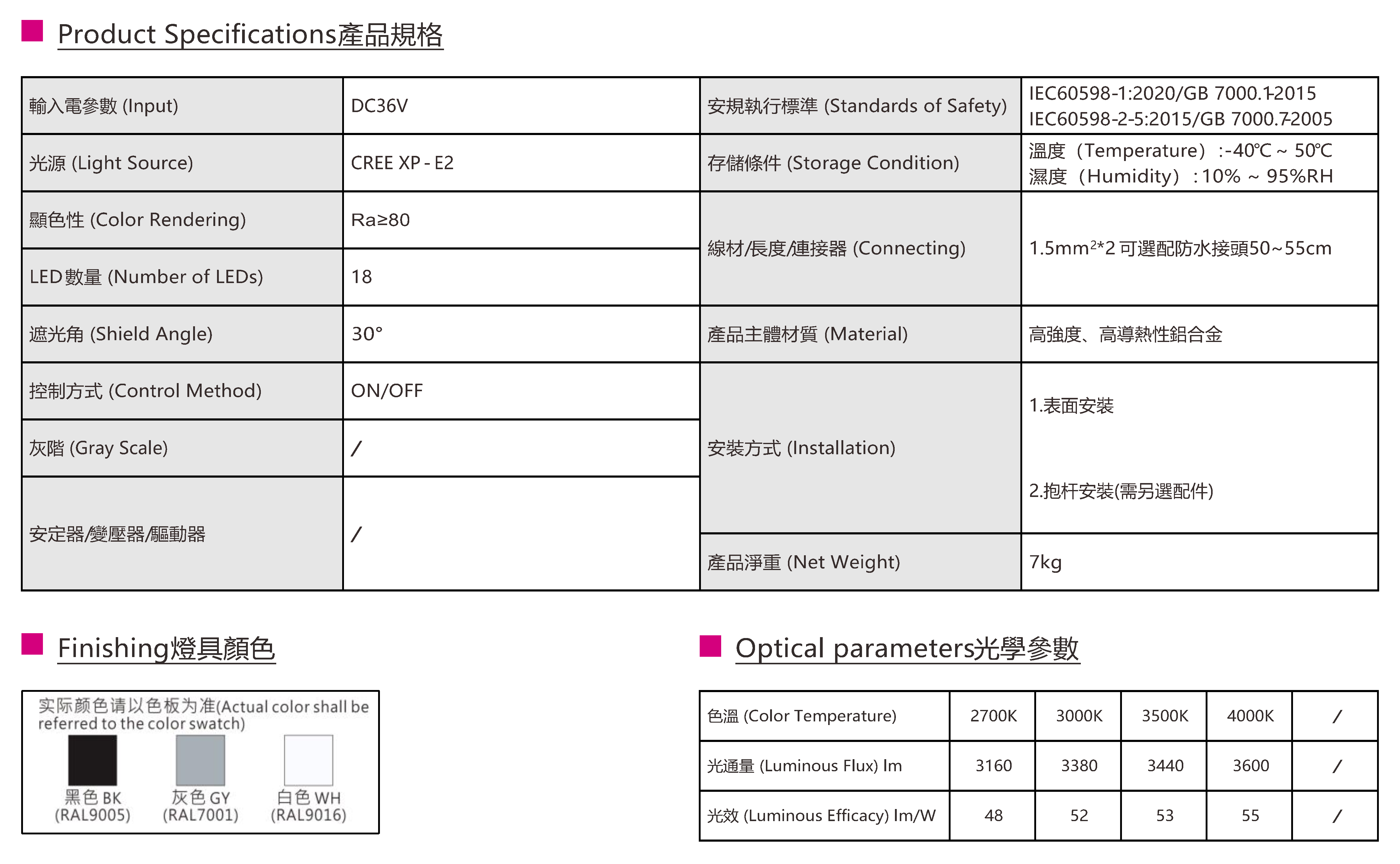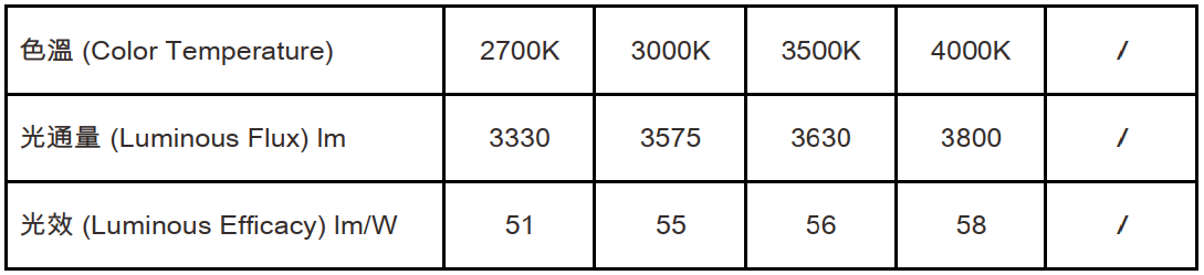 色溫(Color Temperature):2700K、3000K、3500K、4000K