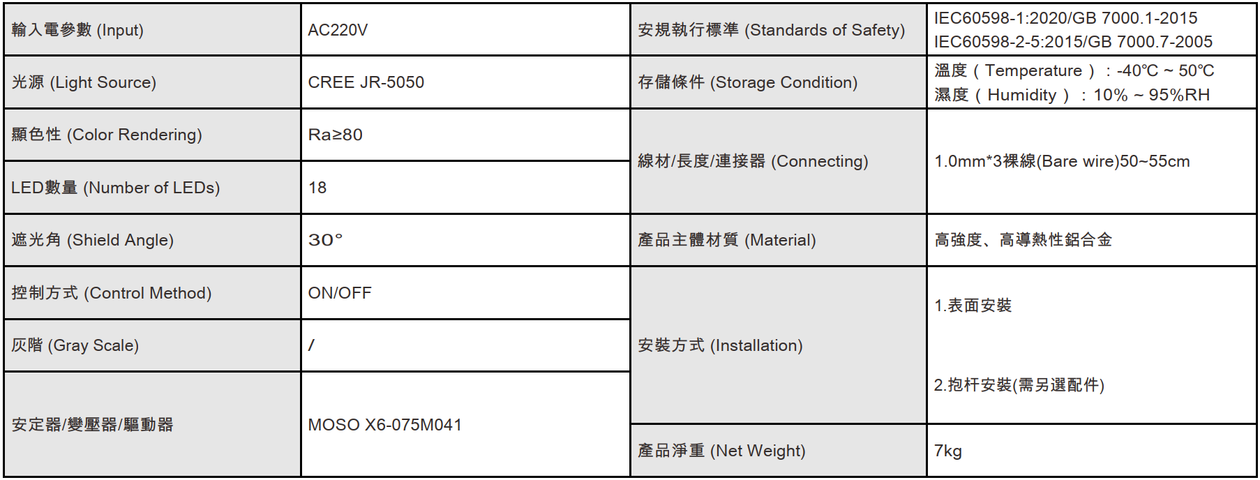 功率: 70W 電壓: AC220V 控制方式:ON/OFF 光色:W 燈數:18 光束角:20°、30°、40°、55°