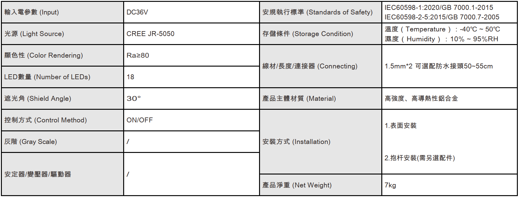 功率: 70W 電壓: DC36V 控制方式:ON/OFF 光色:W 燈數:18 光束角:20°、30°、40°、55°