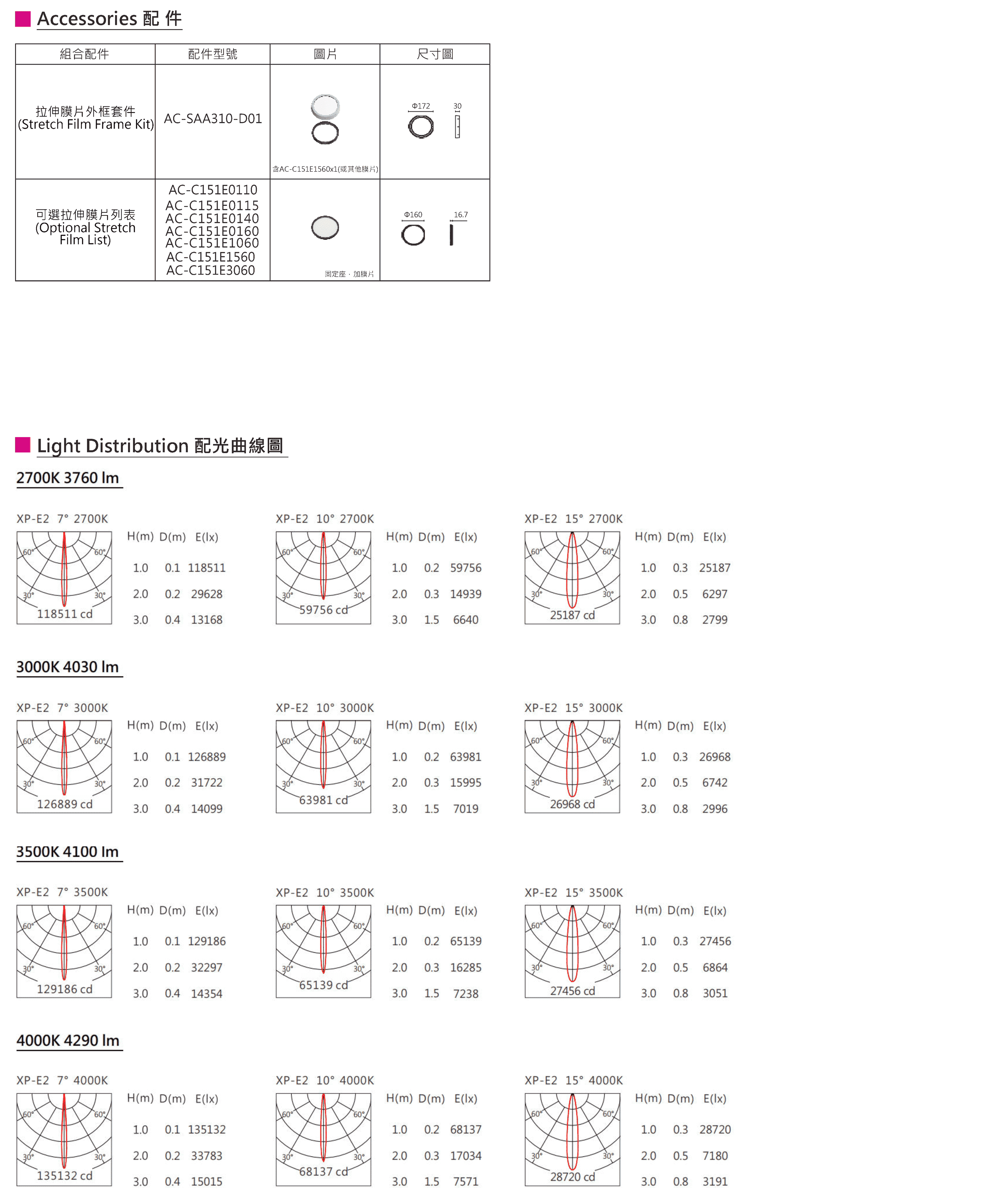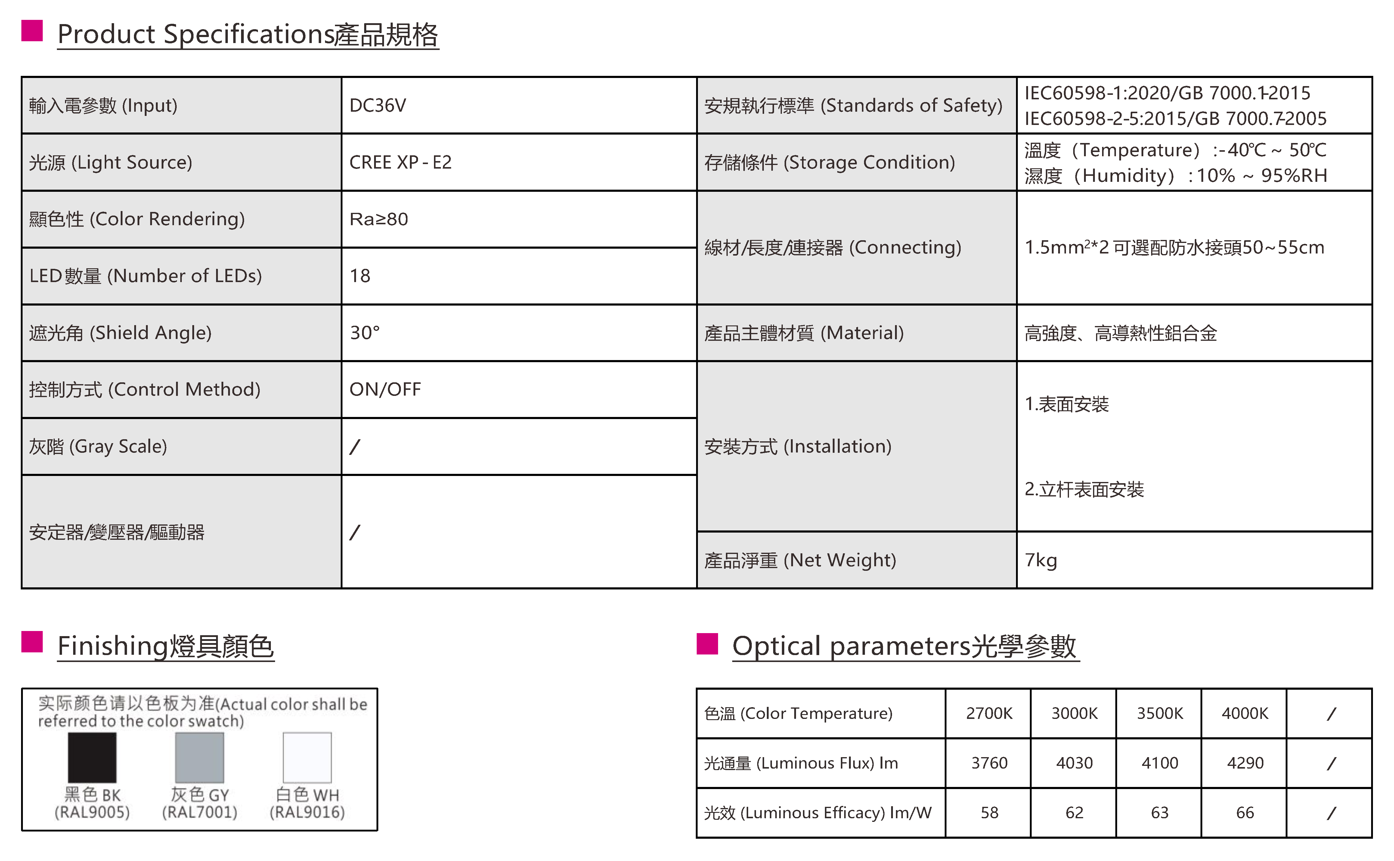 色溫(Color Temperature):2700K、3000K、3500K、4000K