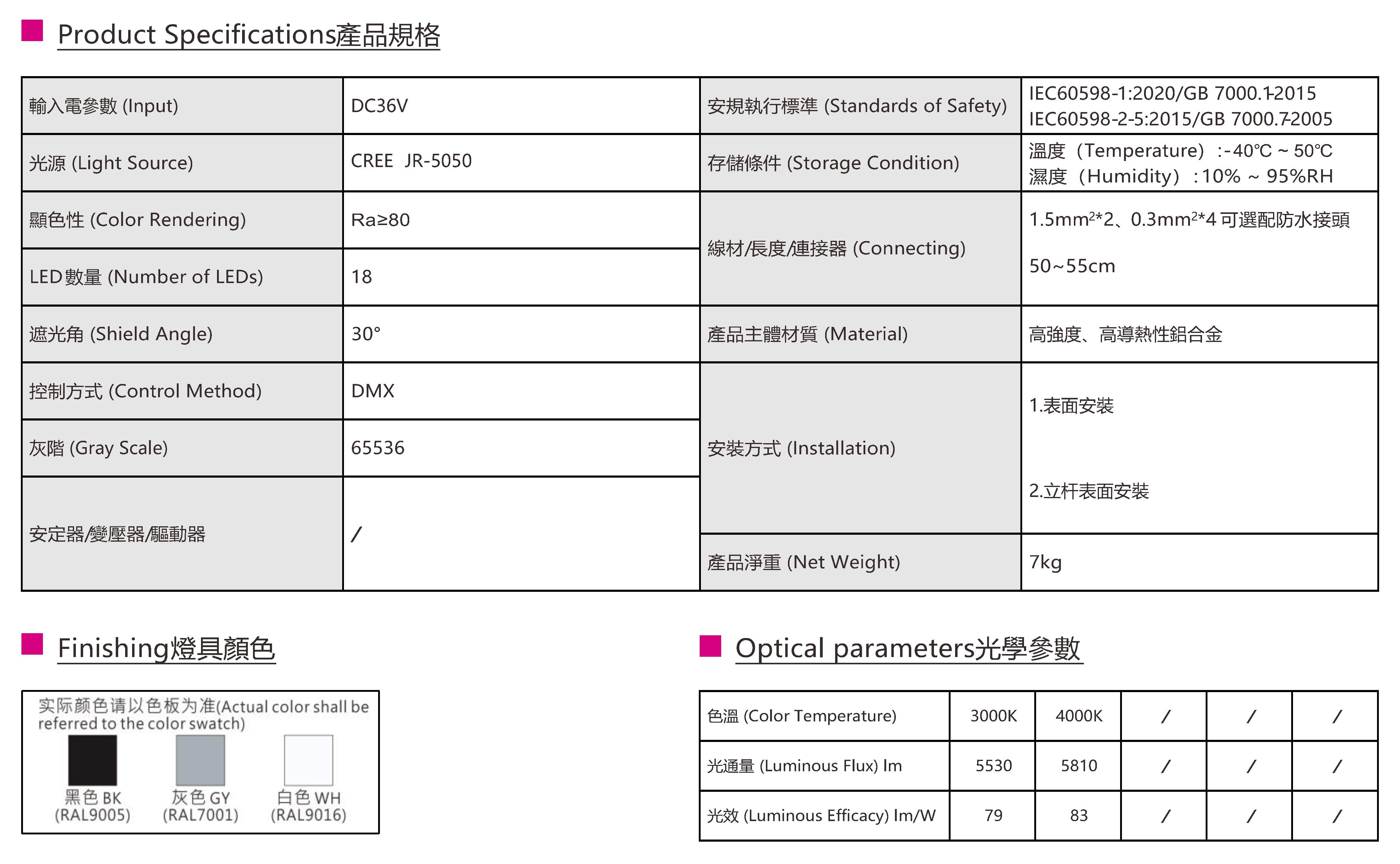 功率: 70W 電壓: DC36V 控制方式:DMX 光色:W 燈數:18 光束角:20°、30°、40°、55°