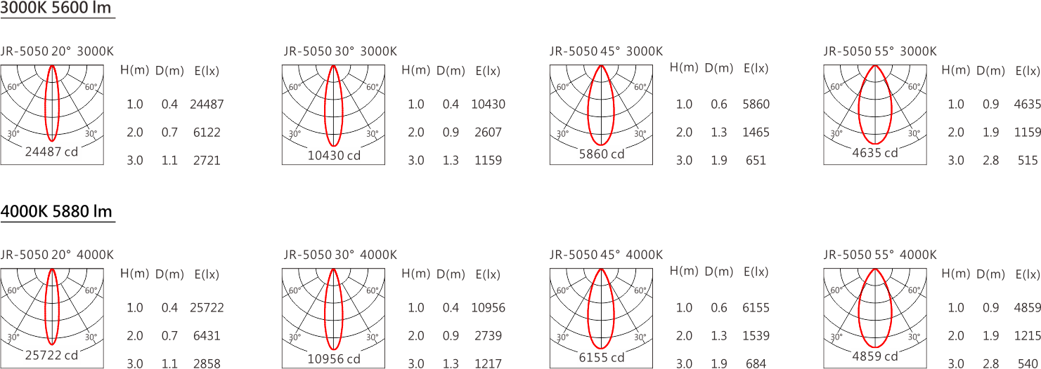 光束角(Beam Angle):20°、30°、40°、55°