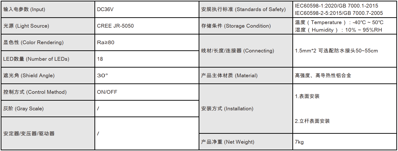 功率: 70W 電壓: DC36V 控制方式:ON/OFF 光色:W 燈數:18 光束角:20°、30°、40°、55°