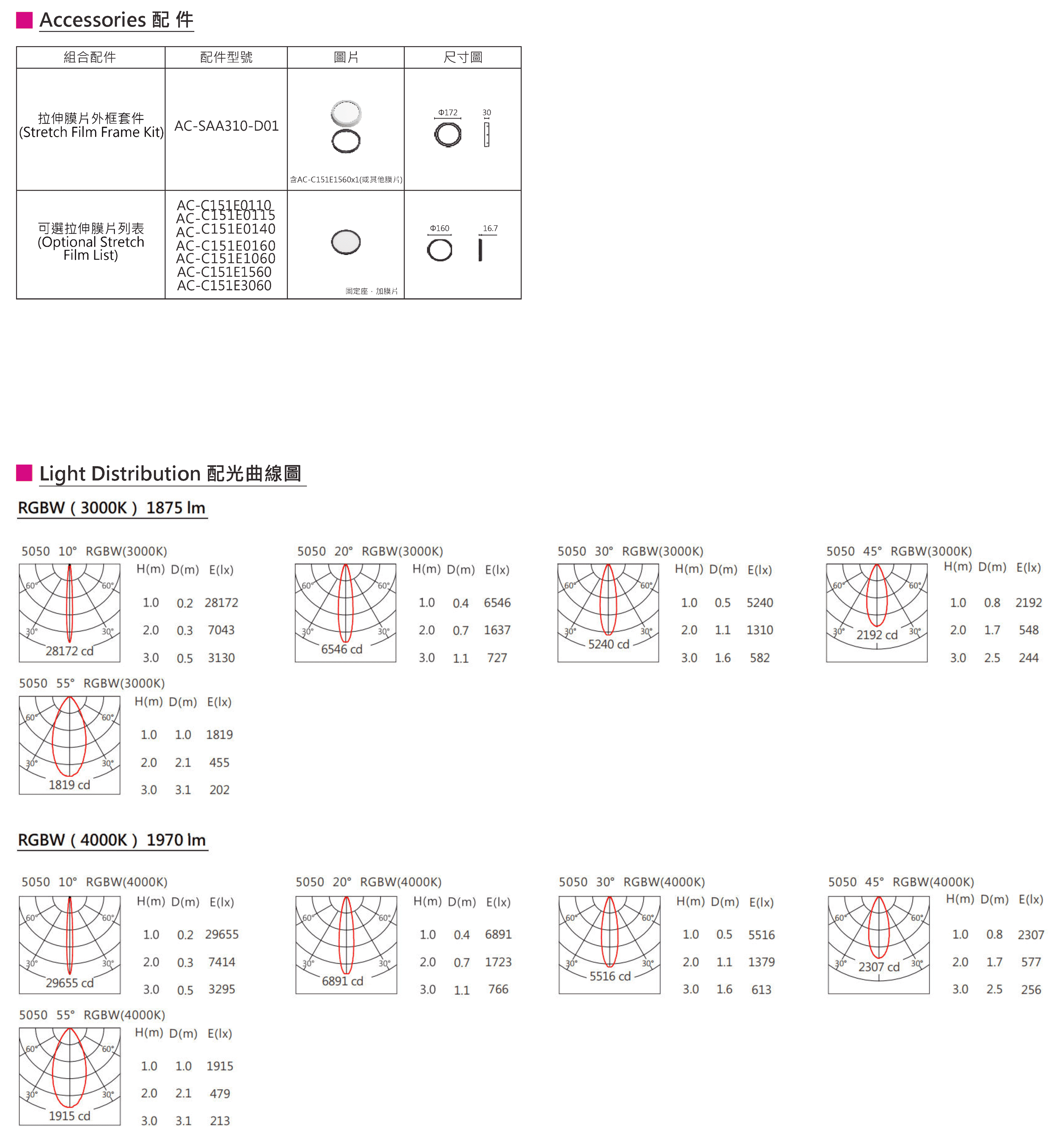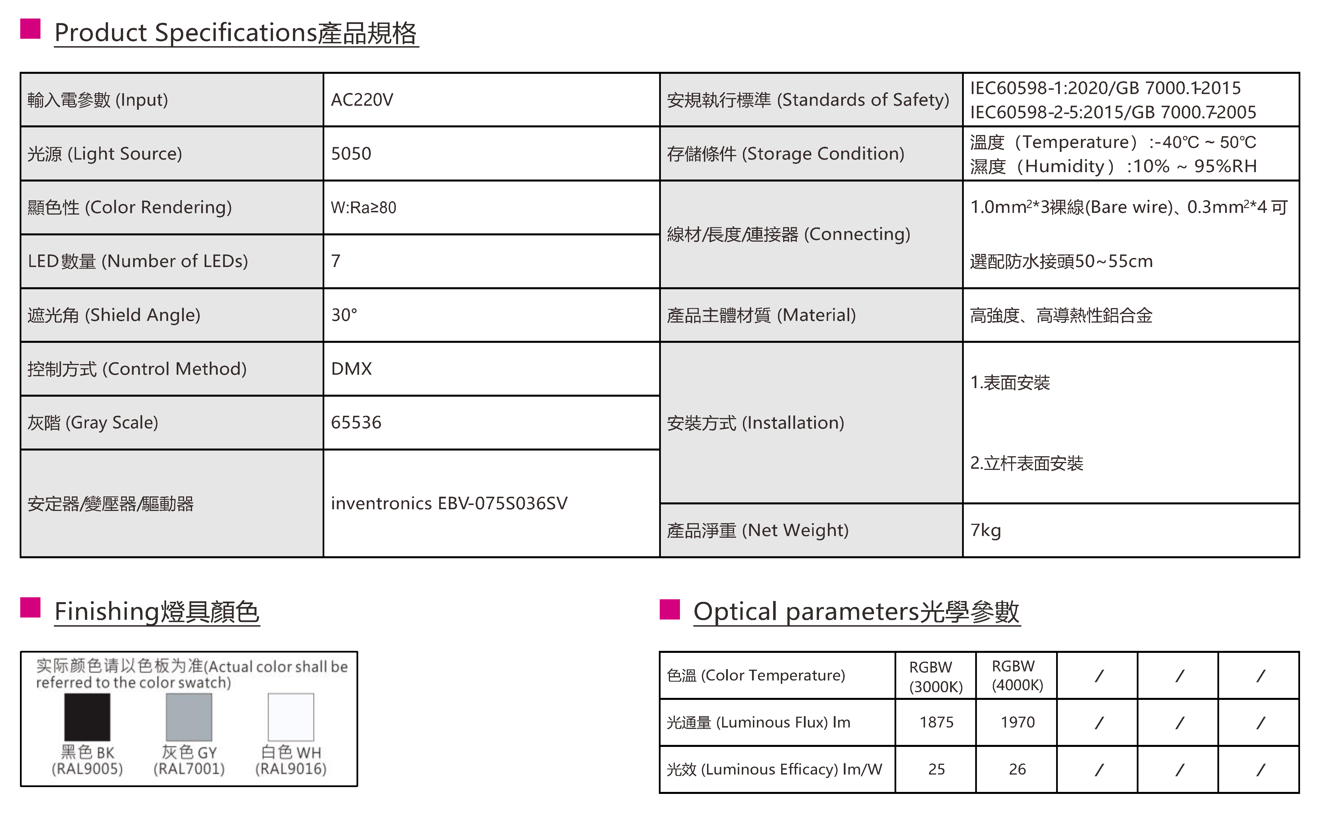 色溫(Color Temperature):RGBW(W:3000K、4000K)