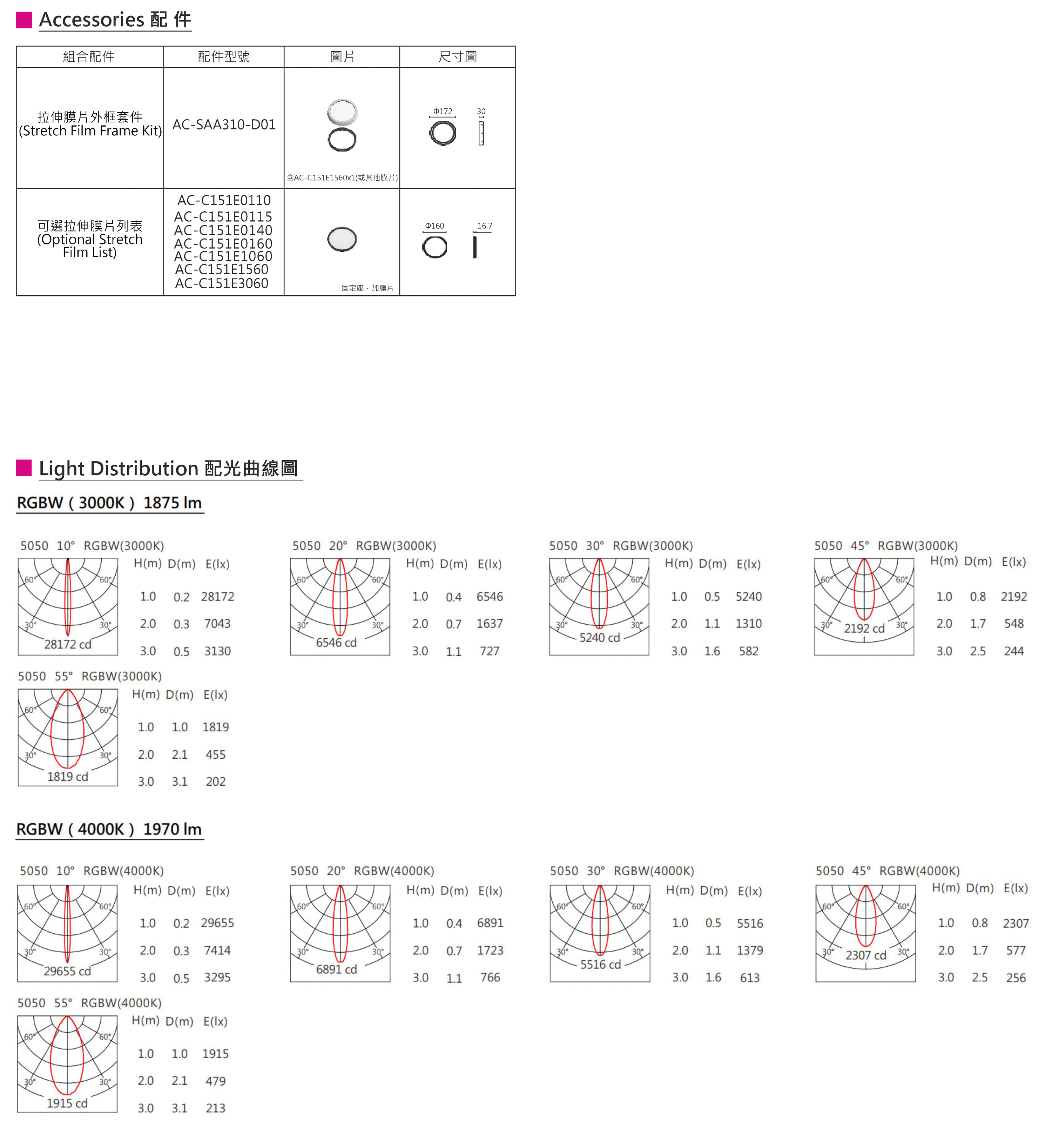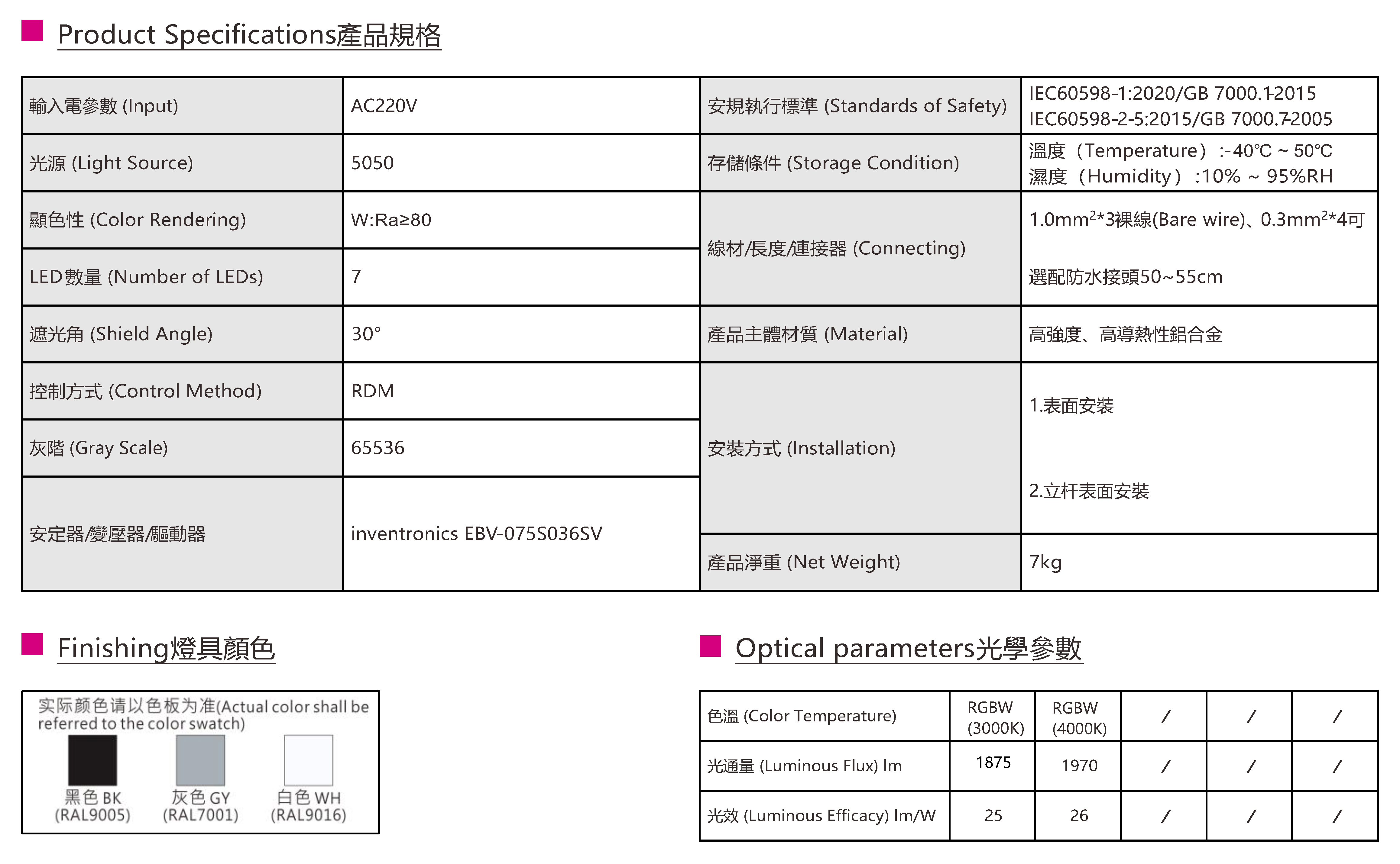 色溫(Color Temperature):RGBW(W:3000K、4000K)