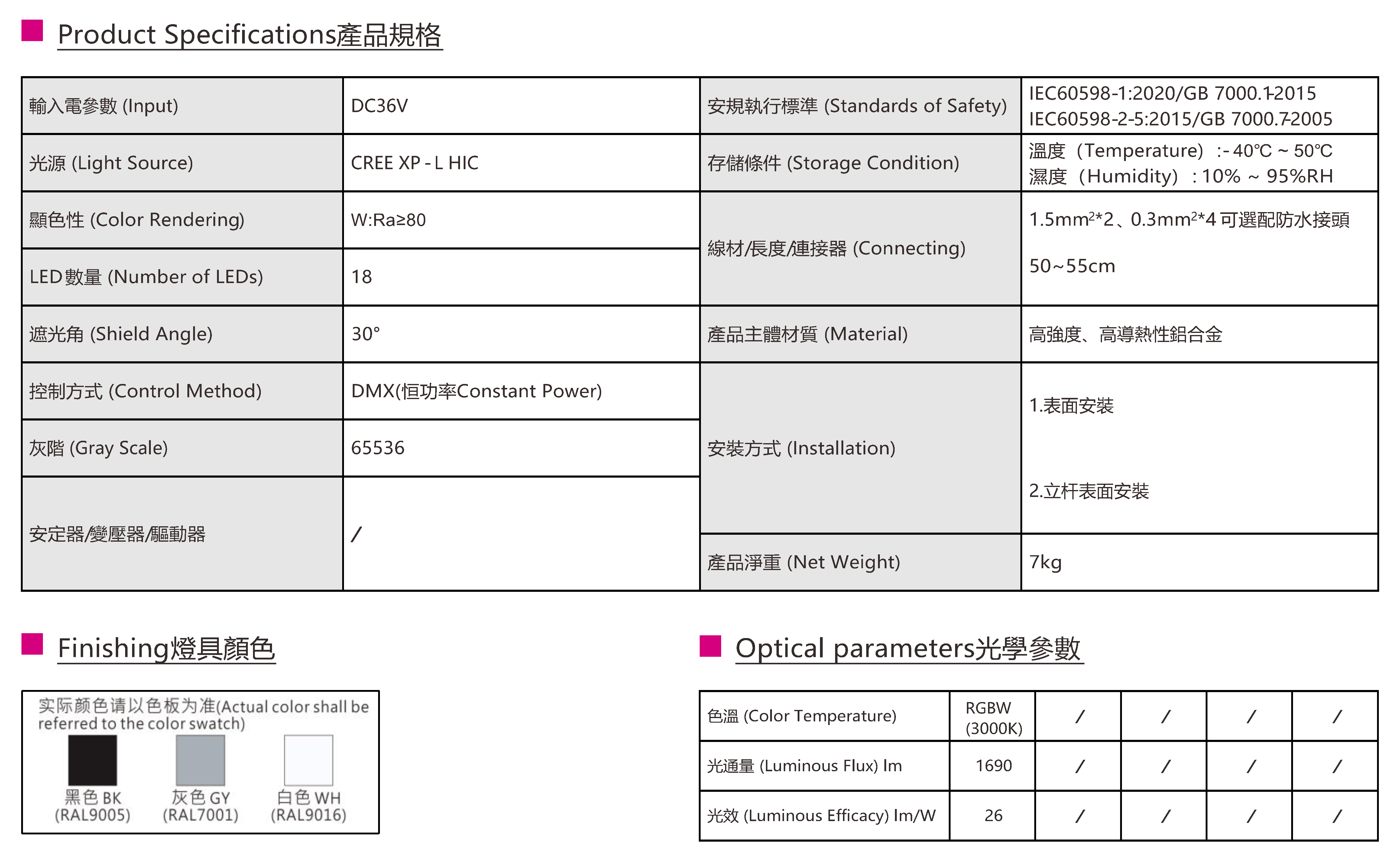 功率: 65W 電壓: DC36V 控制方式:DMX 光色:RGBW 燈數:18 光束角:15°、30°、45°、55°