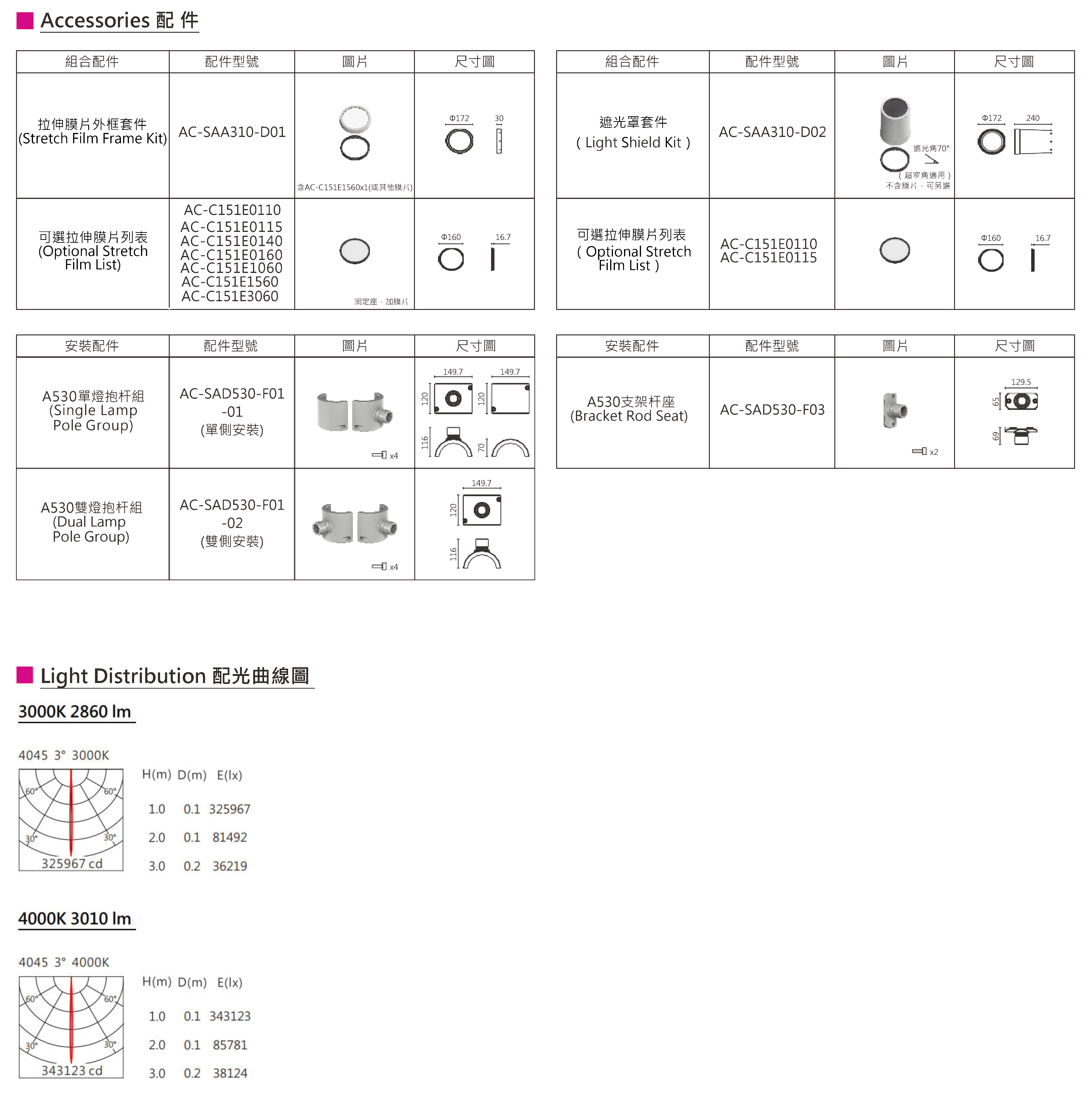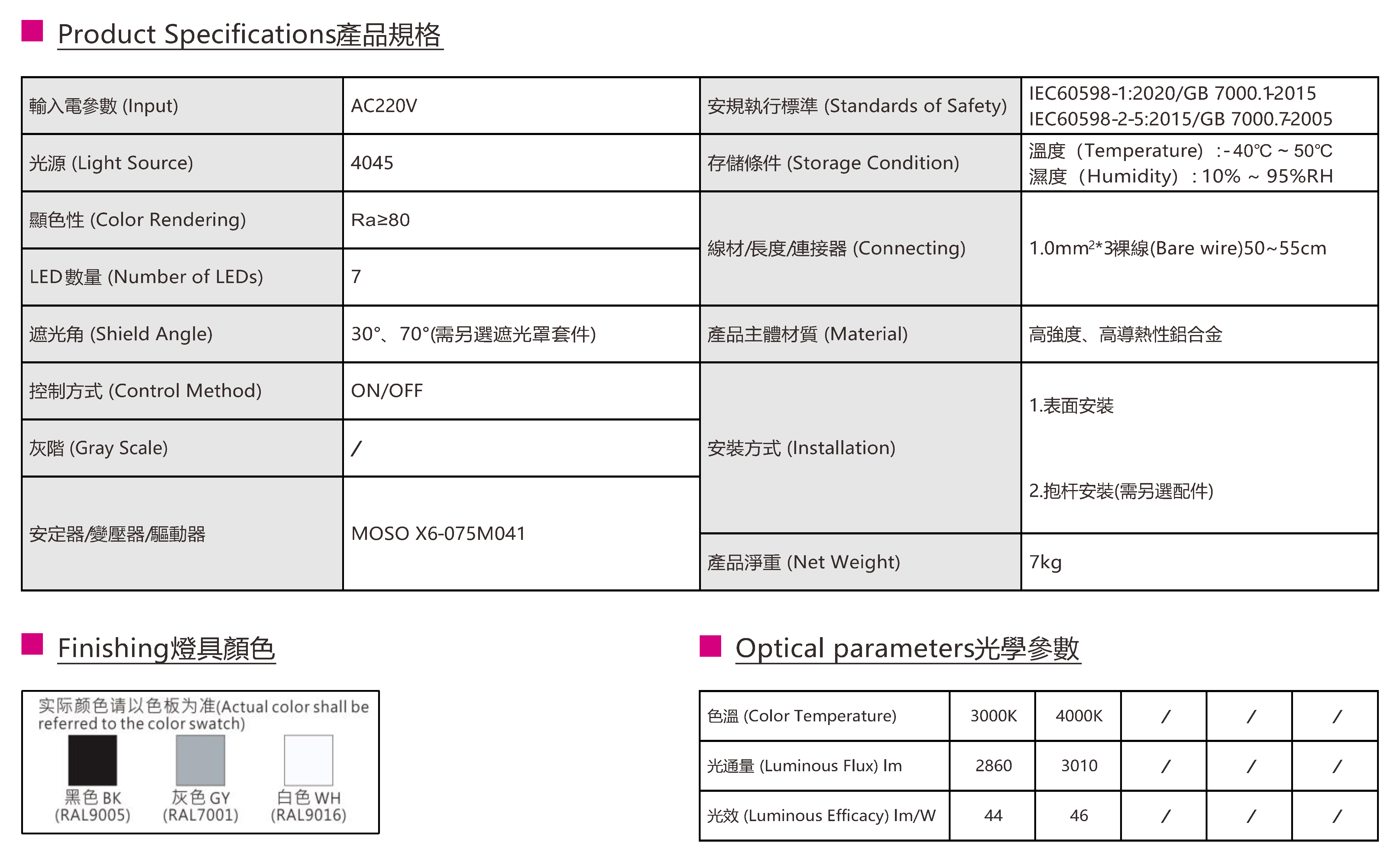 色溫(Color Temperature):3000K、4000K