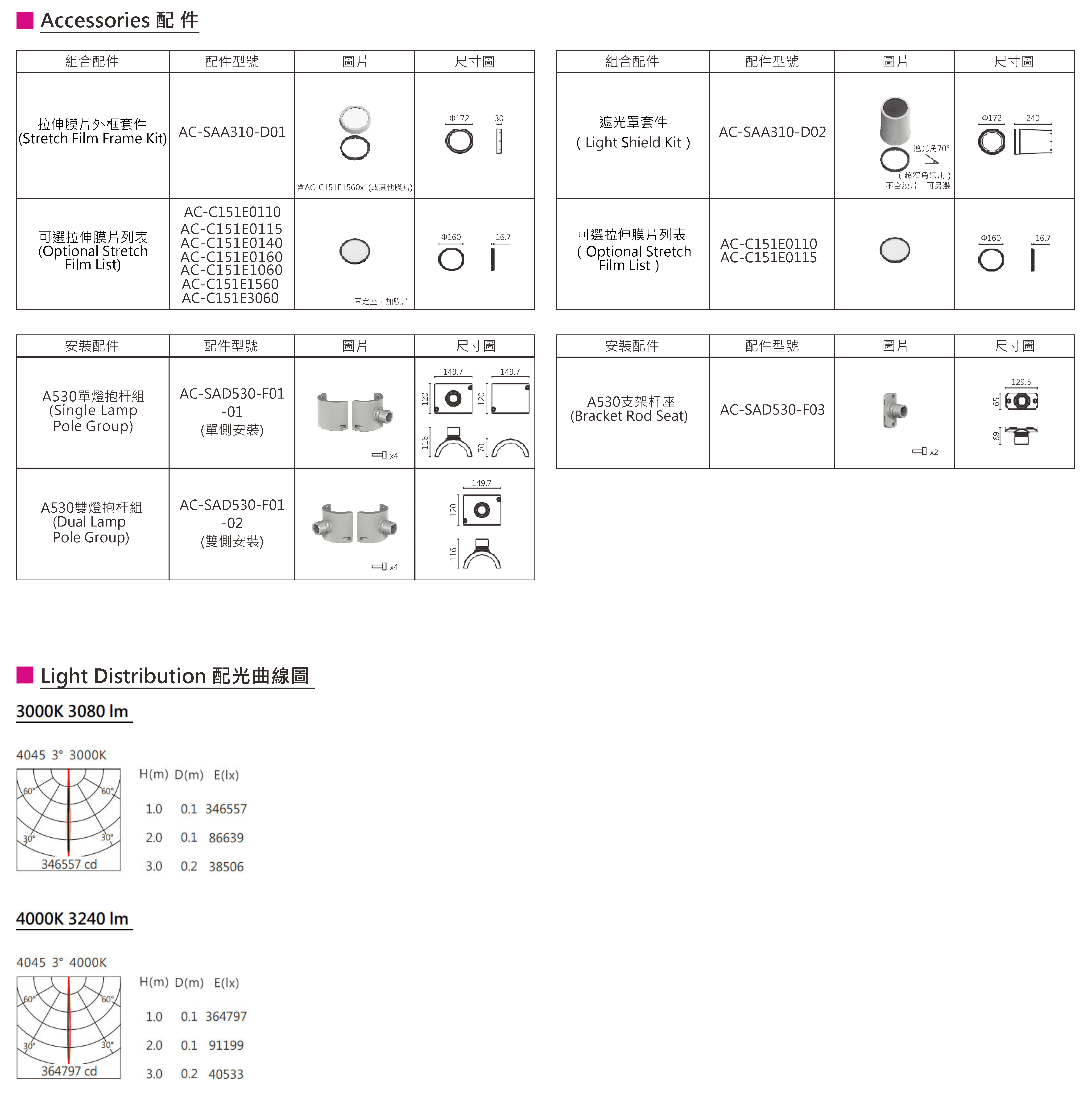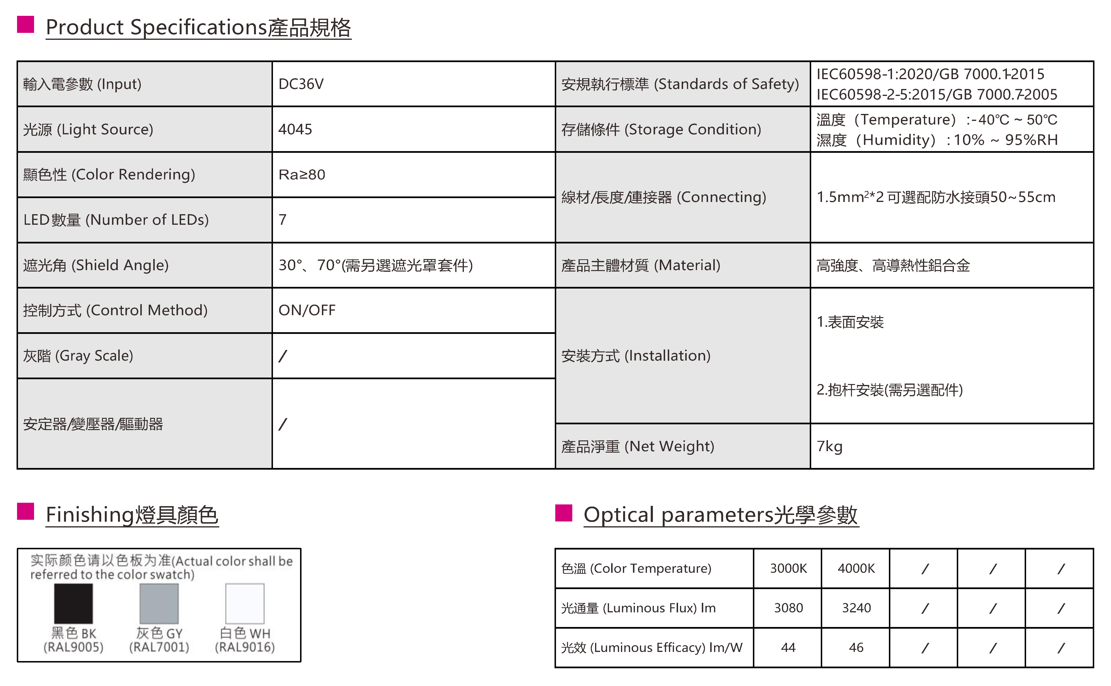 色溫(Color Temperature):3000K、4000K