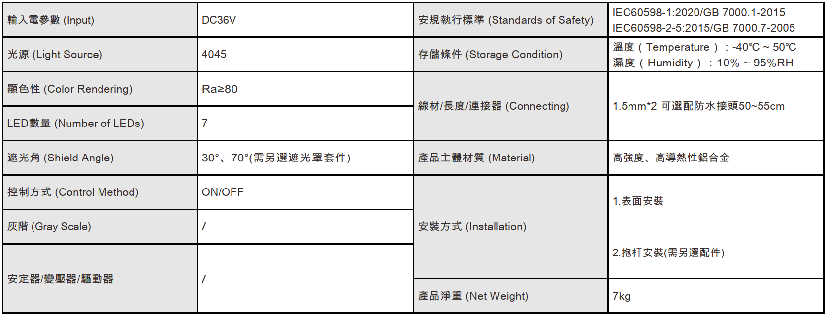 功率: 70W 電壓: DC36V 控制方式:ON/OFF 光色:W 燈數:7 光束角:3°