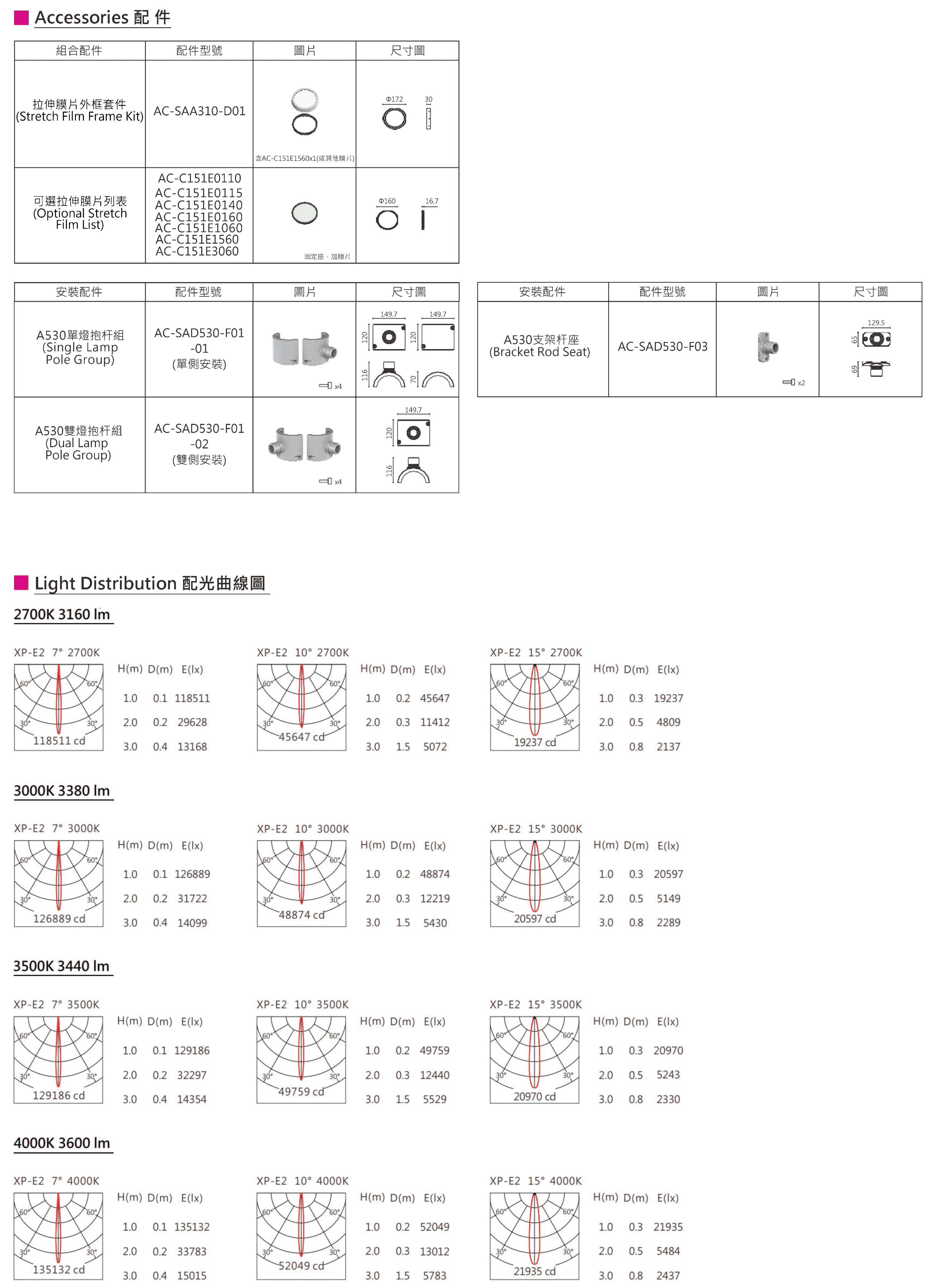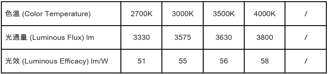 色溫(Color Temperature):2700K、3000K、3500K、4000K