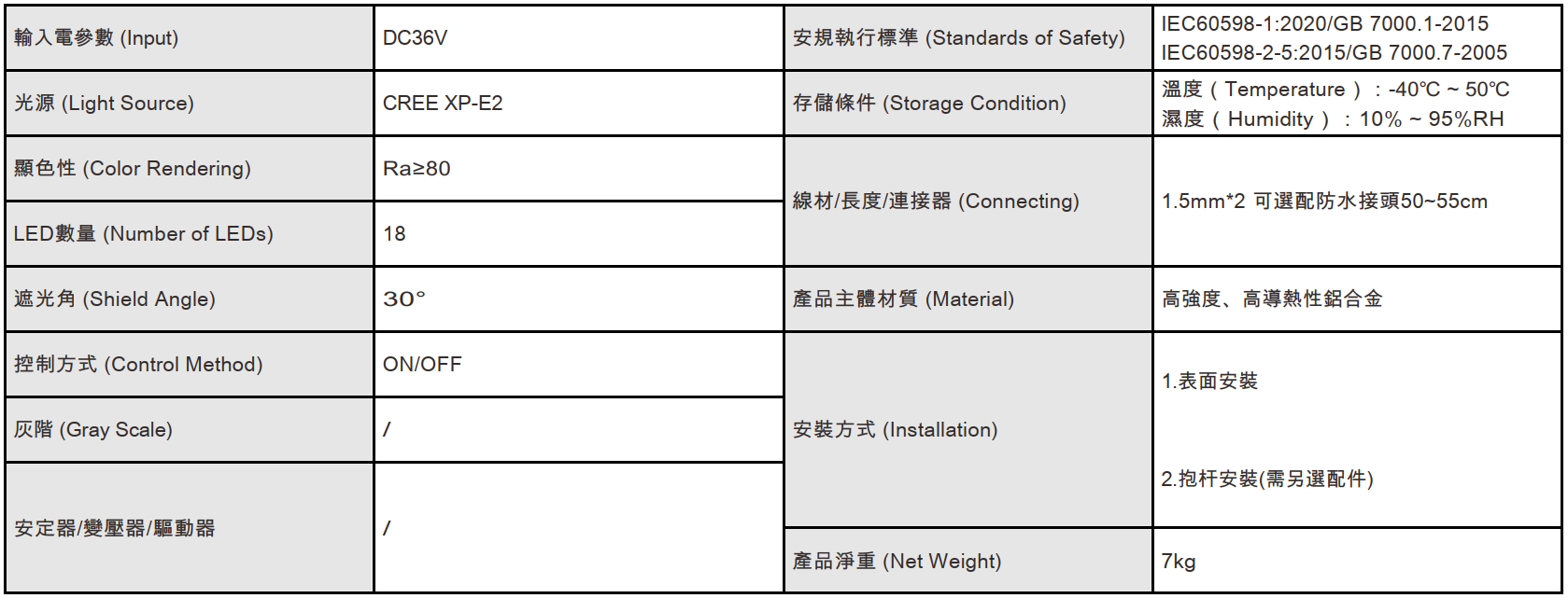 功率: 65W 電壓: DC36V 控制方式:ON/OFF 光色:W 燈數:18 光束角:7°、10°、15°