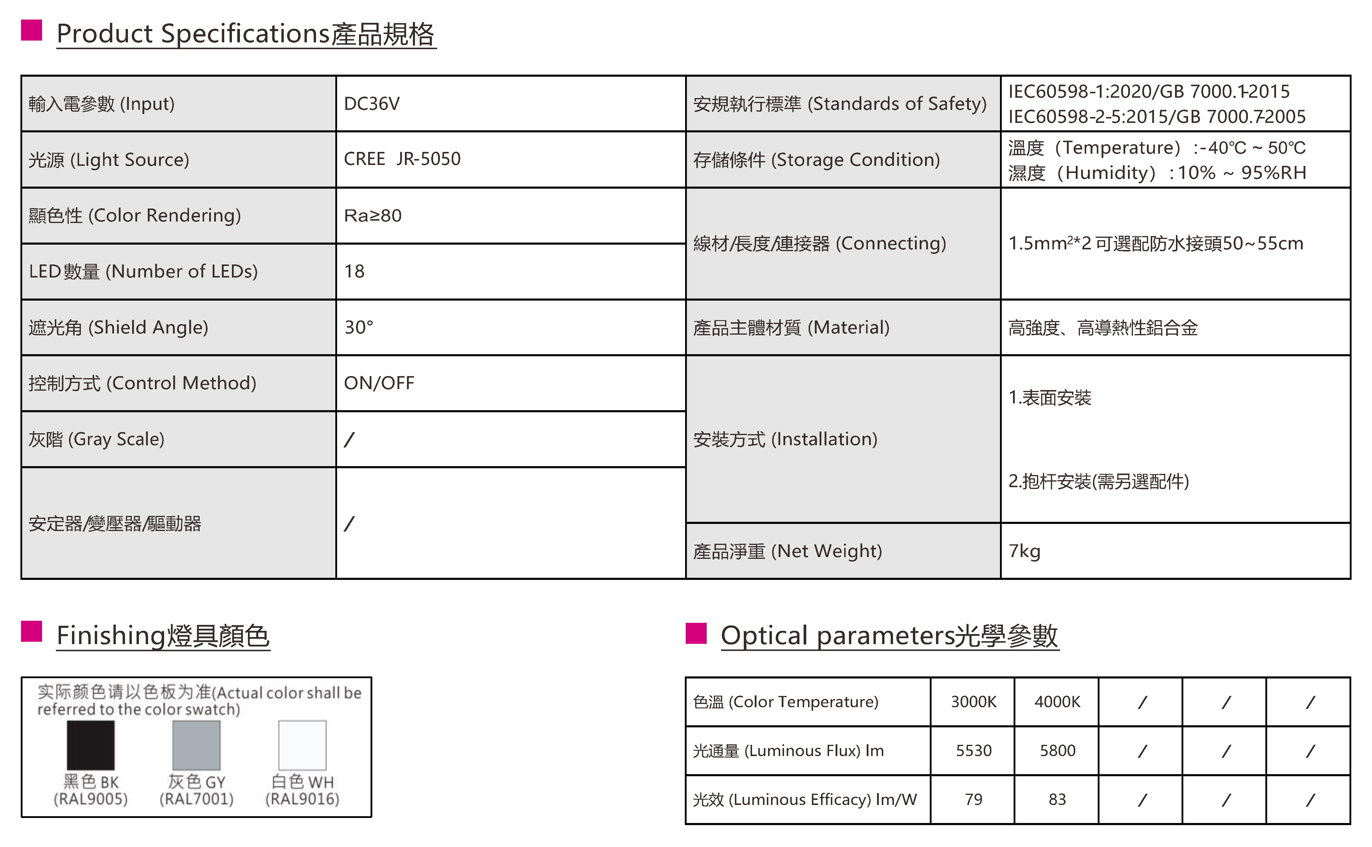 功率: 70W 電壓: DC36V 控制方式:ON/OFF 光色:W 燈數:18 光束角:20°、30°、45°、55°