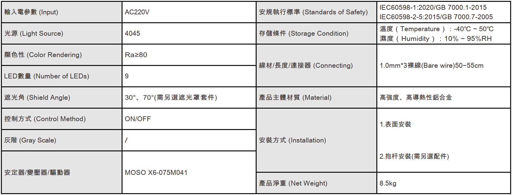 功率: 85W 電壓: AC220V 控制方式:ON/OFF 光色:W 燈數:9 光束角:3°