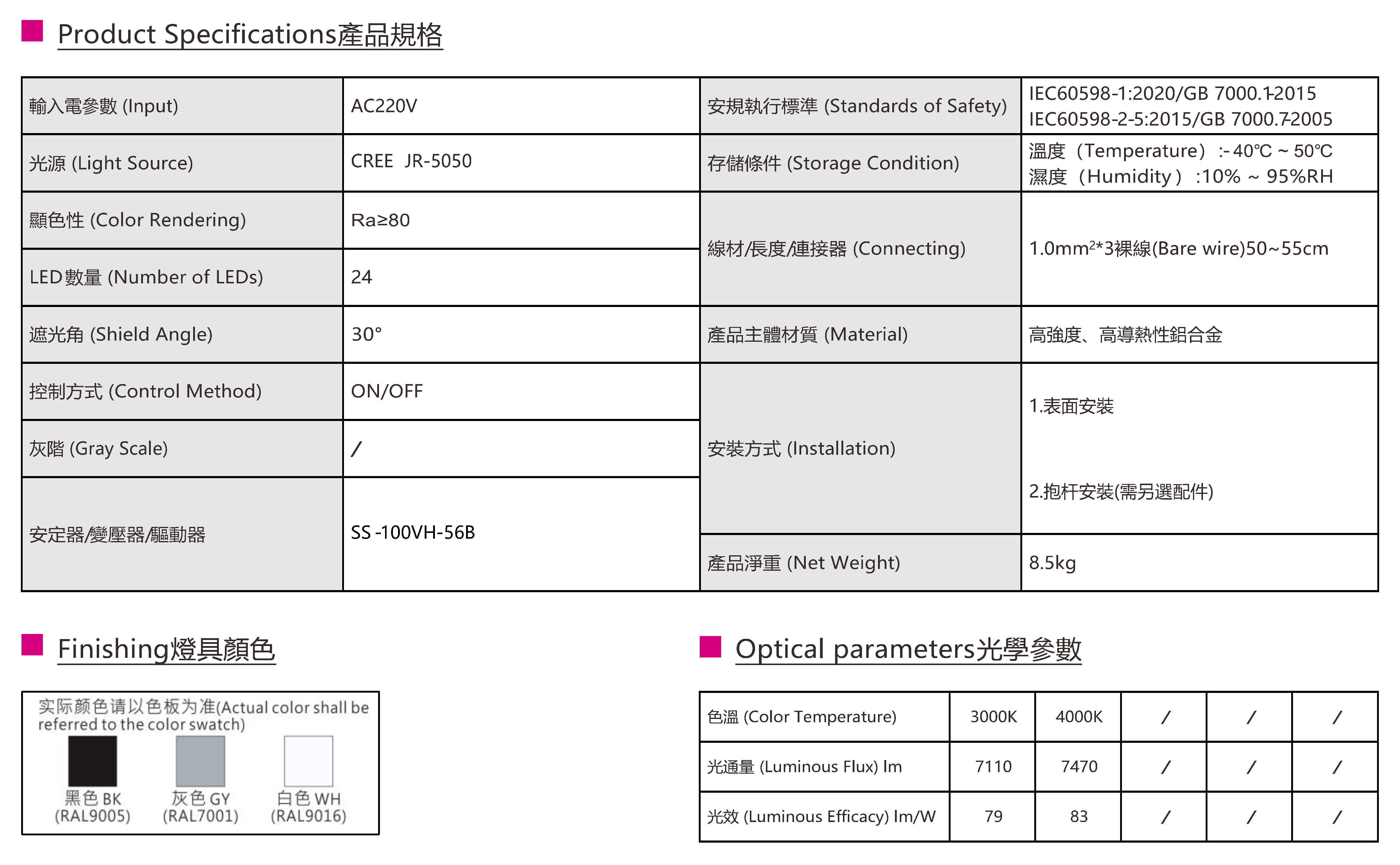 色溫(Color Temperature):3000K、4000K