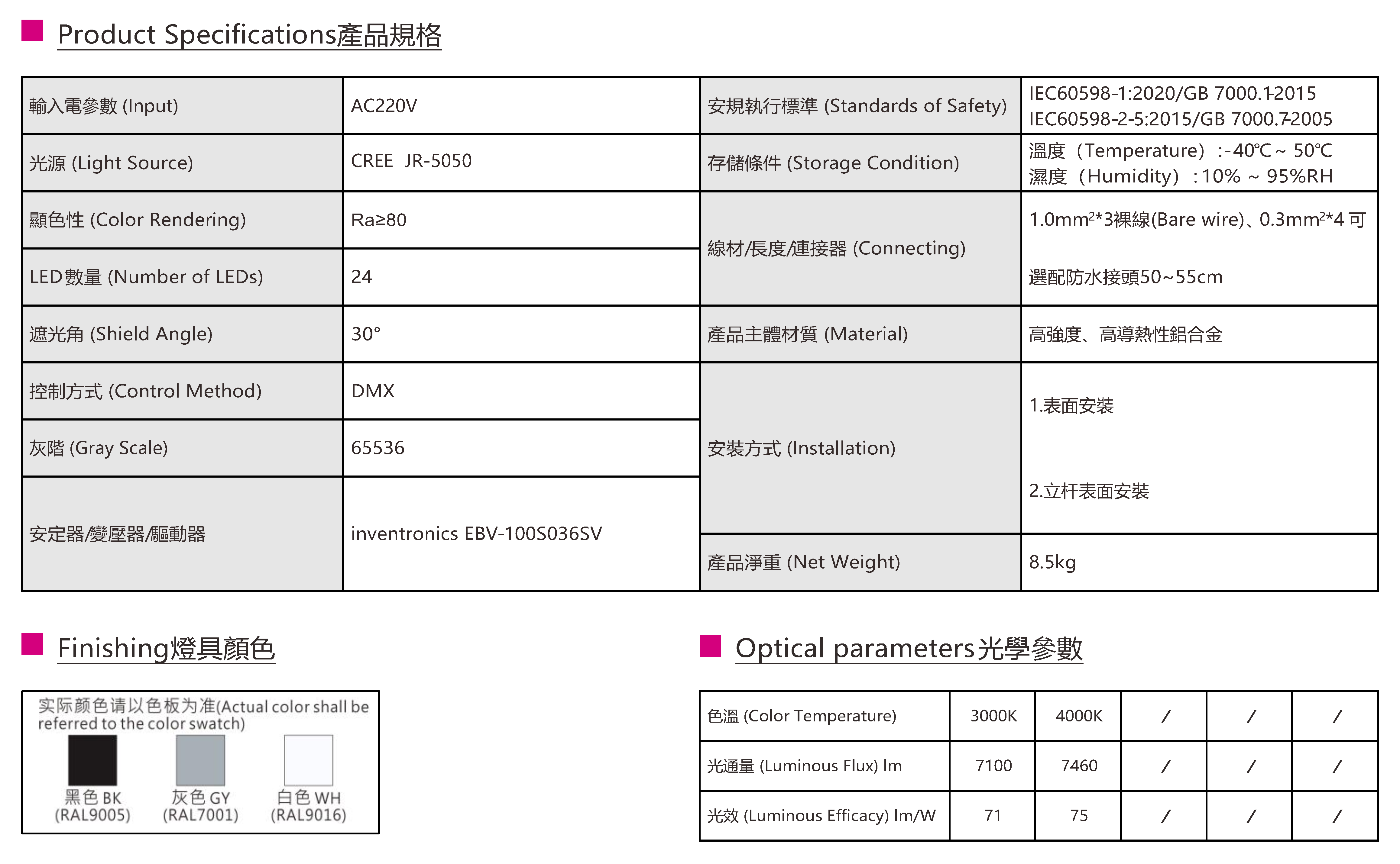 功率: 100W 電壓:AC220V 控制方式:DMX 光色:W 燈數:24 光束角:20°、30°、45°、55°