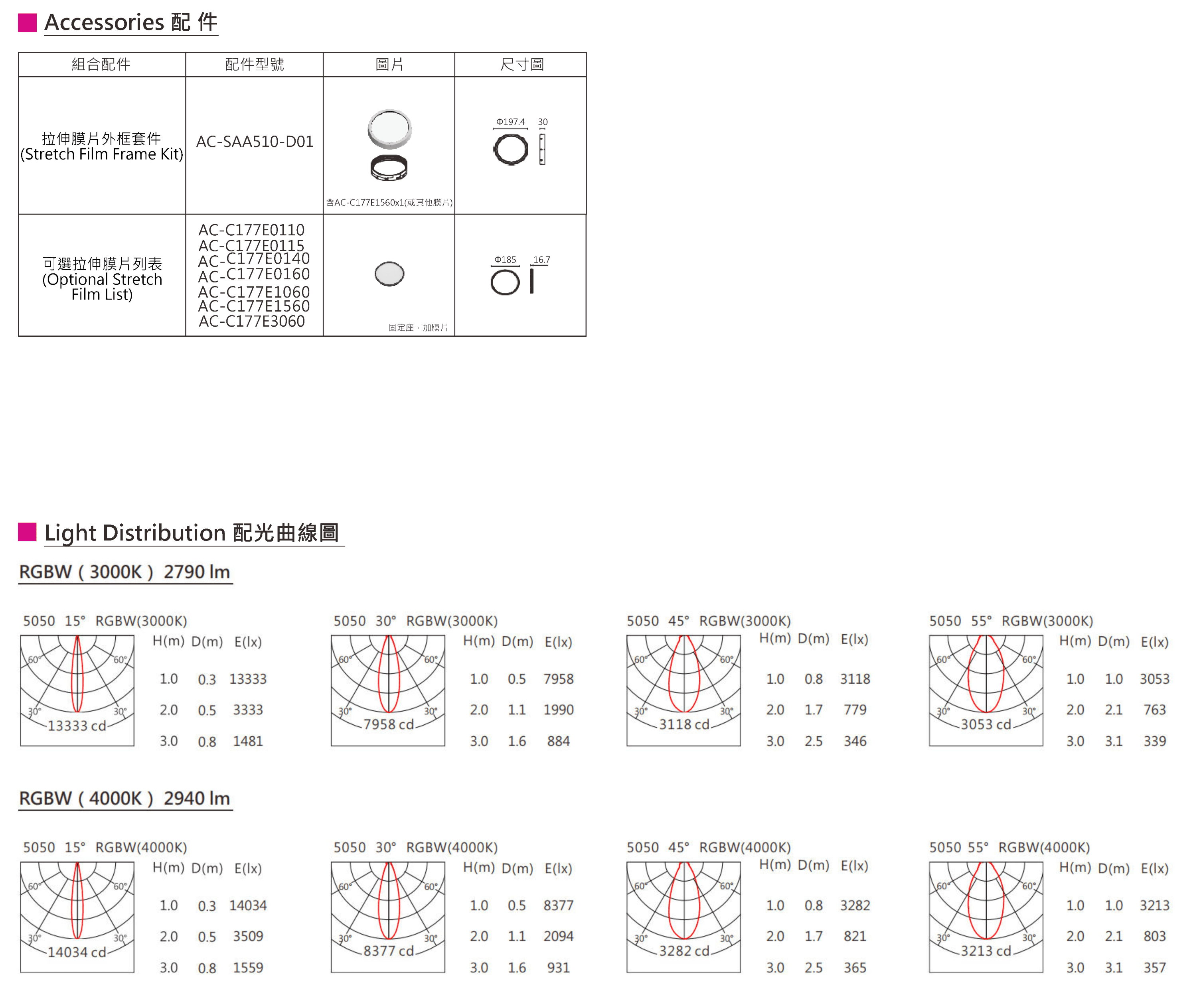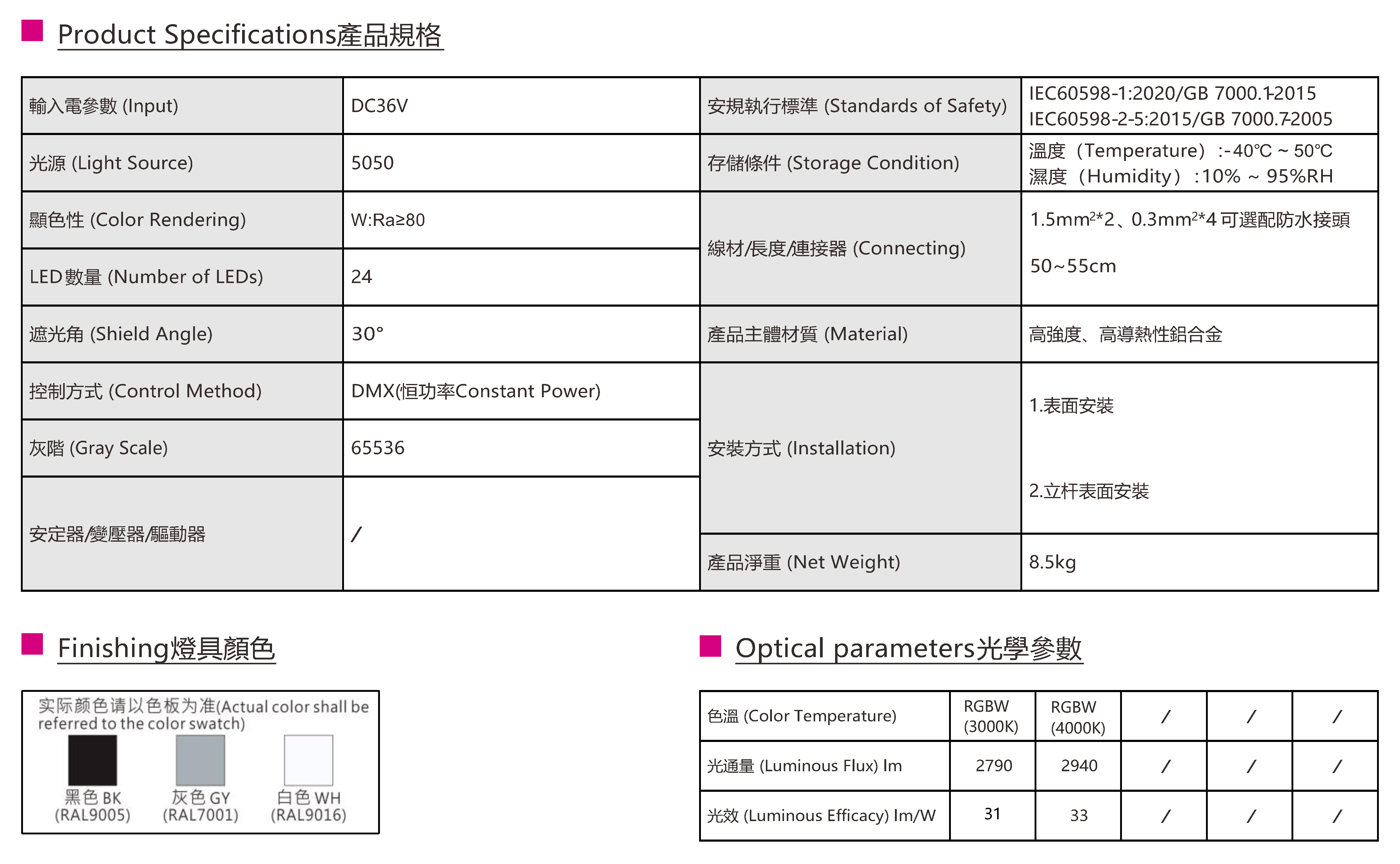 色溫(Color Temperature):RGBW(W:3000K、4000K)